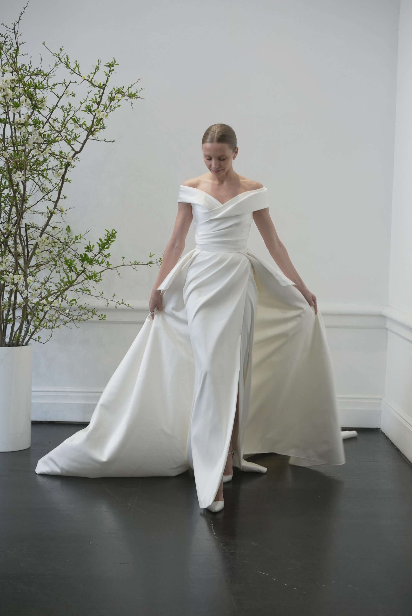 ドレープ感のあるミカドシルクで仕立てられた、彫刻的なラインと軽やかな流れが合わさったルック。取り外し可能なオーバースカートにはティアードフリルがあしらわれ、ウエスト下のドレープは、ふんわりしている軽さも感じられますが、花嫁の身体をなぞるように、美しいシルエットを叶えます。