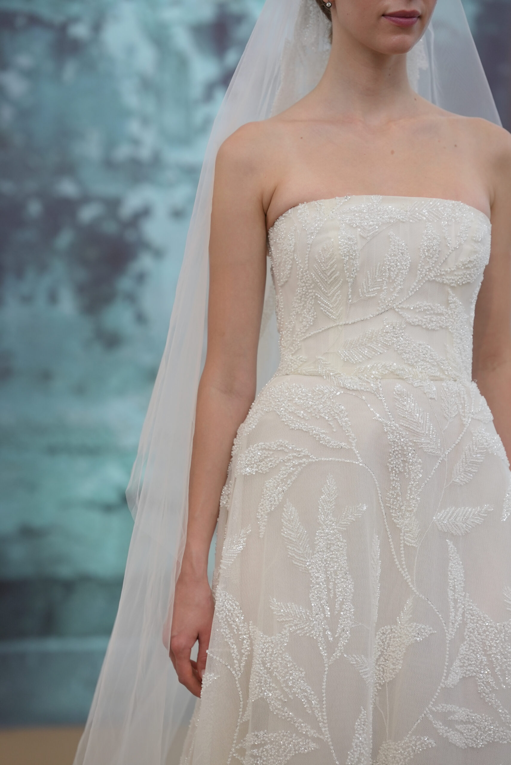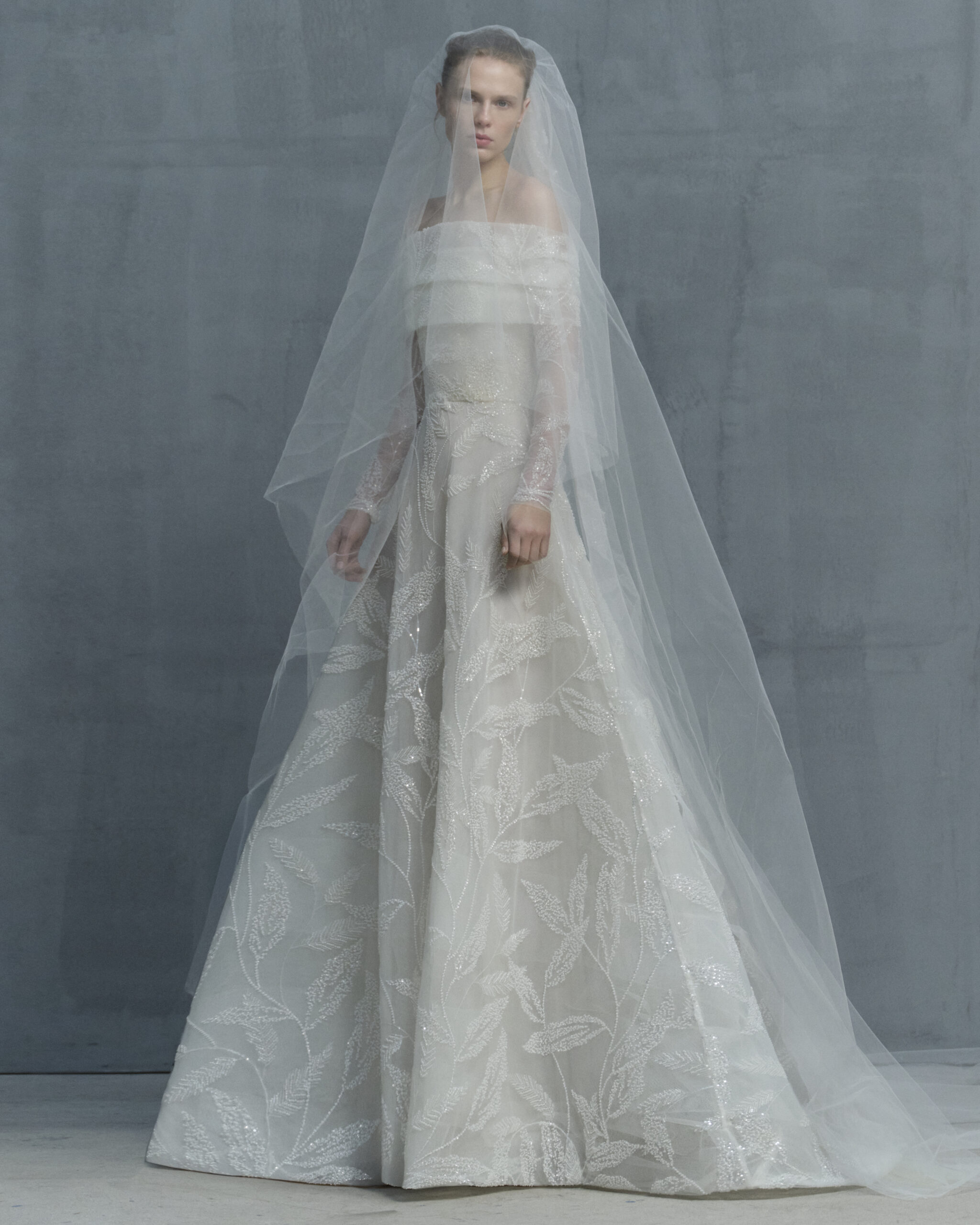 繊細な葉の模様をビーズで全面に刺繍された、自然の優雅さを想い起させる1着。エリーサーブらしい唯一無二な模様は、これまでも多くの花嫁に愛されてきました。