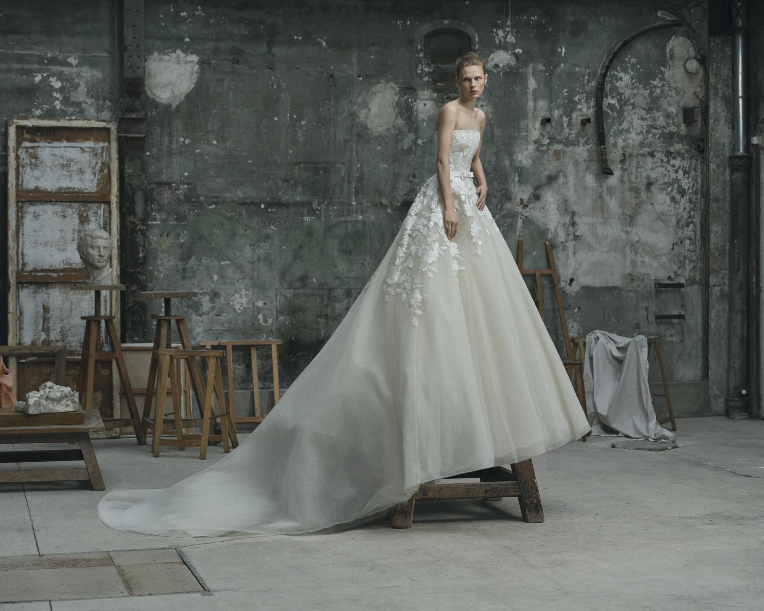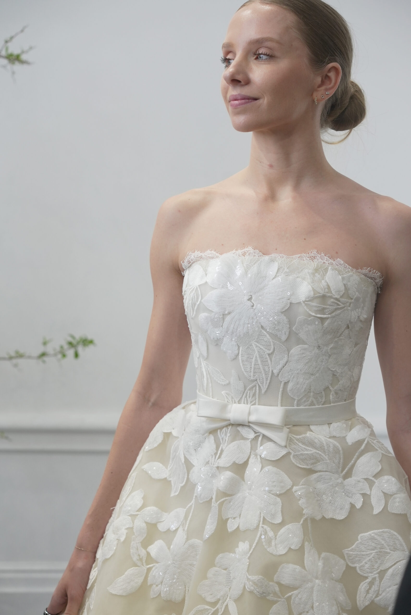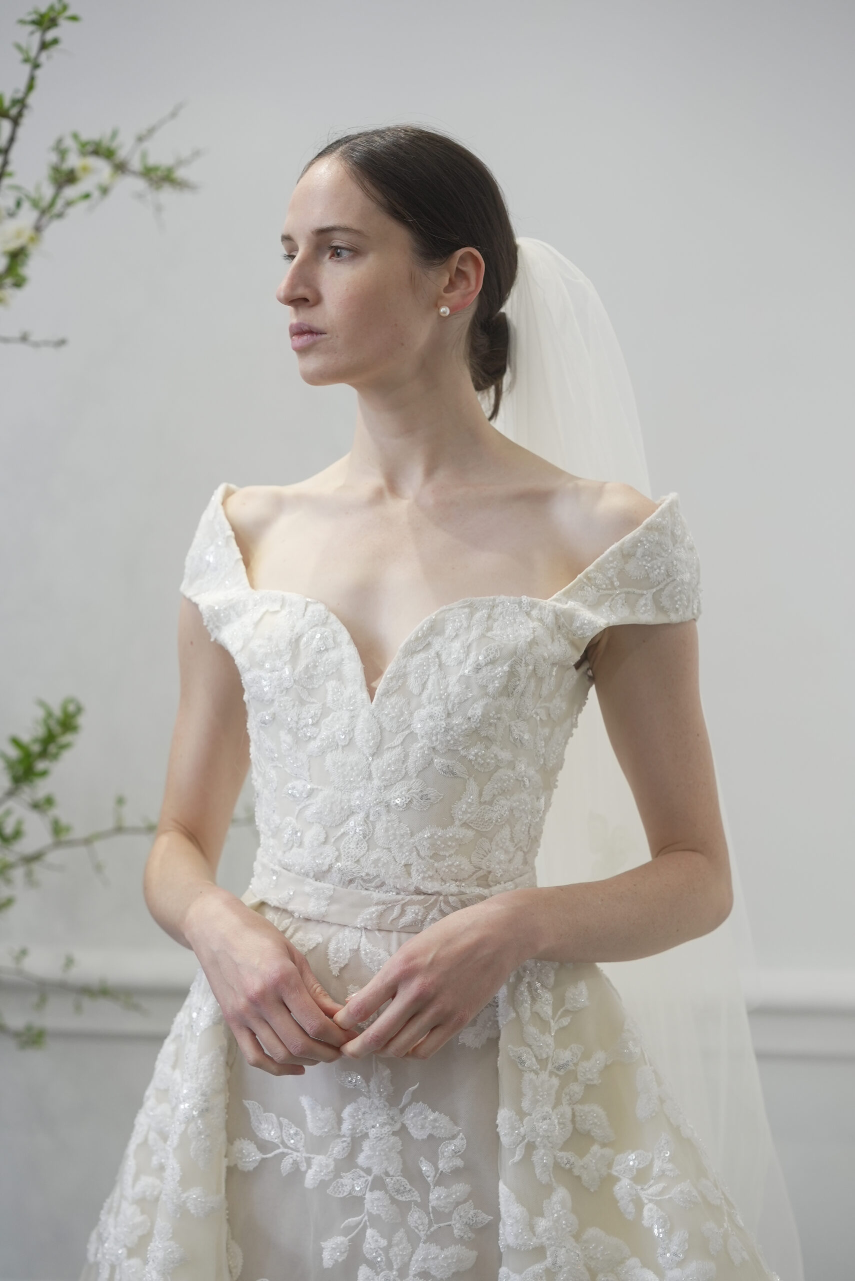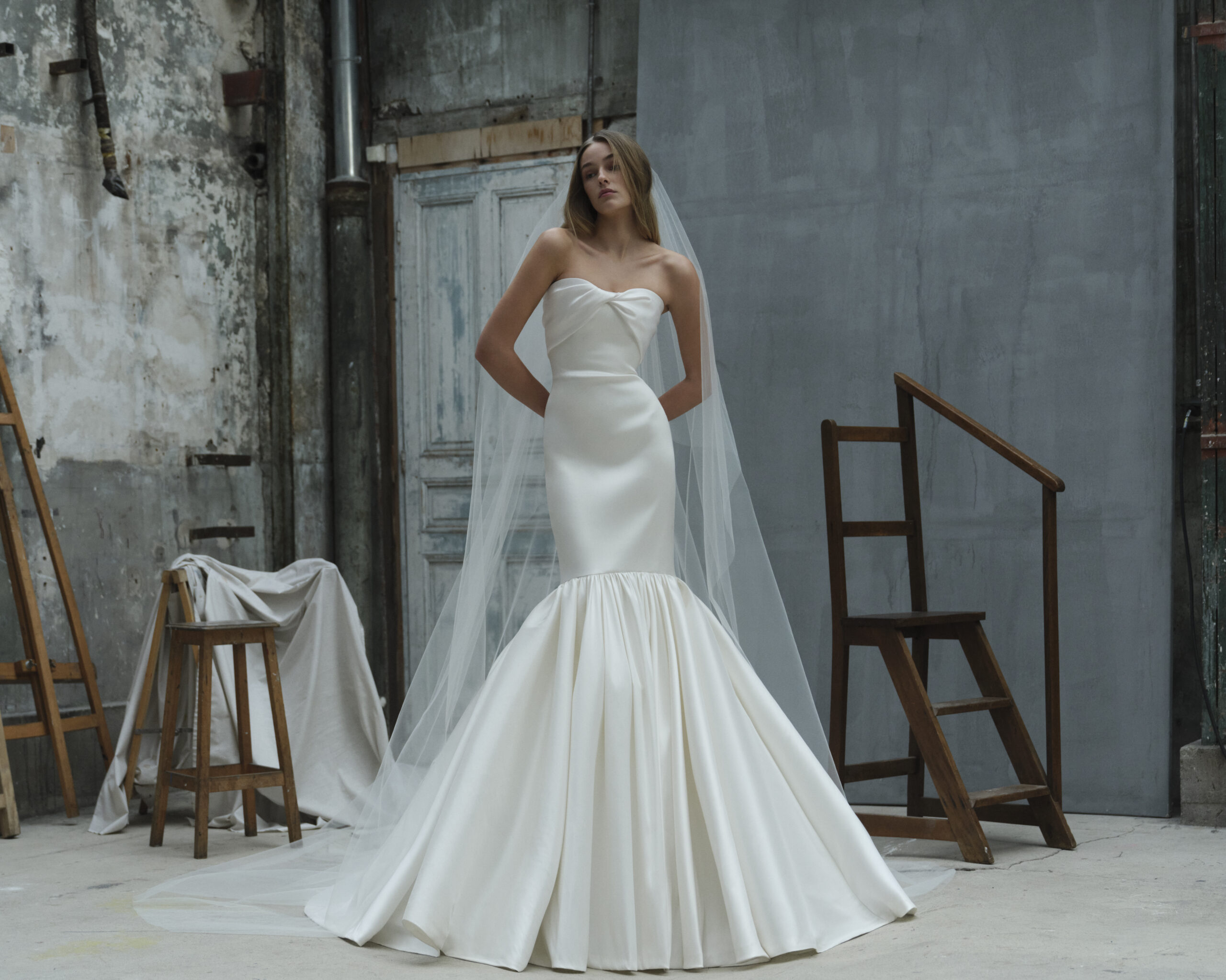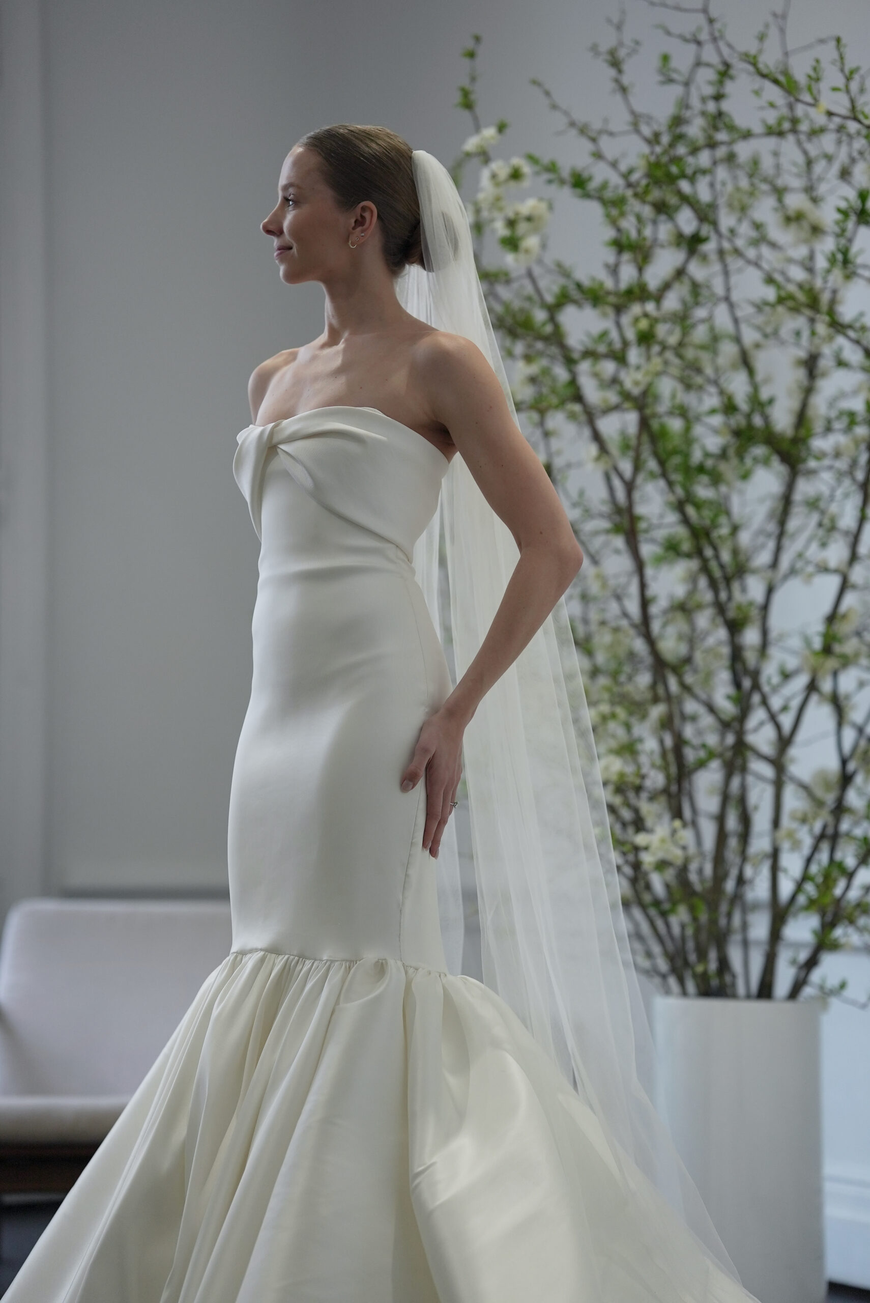 カートが、構築的なシルエットに柔らかな動きを加え、優雅で現代的なブライ