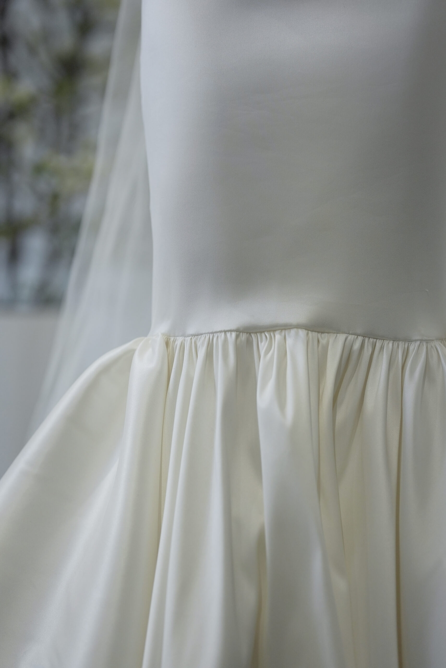 ダルフォルムを描きます。ドレス1着の中で織りなす様々な曲線やギャザーはまさに芸術。彫刻で作り上げたかのような女性の真の美しさが込められています。シンプルなボディと裾元へのギャザーの落差は、20年もの間メゾンのクチュールテクニックを間近で見てきたトリートのアトリエも技術力に驚いたとか。