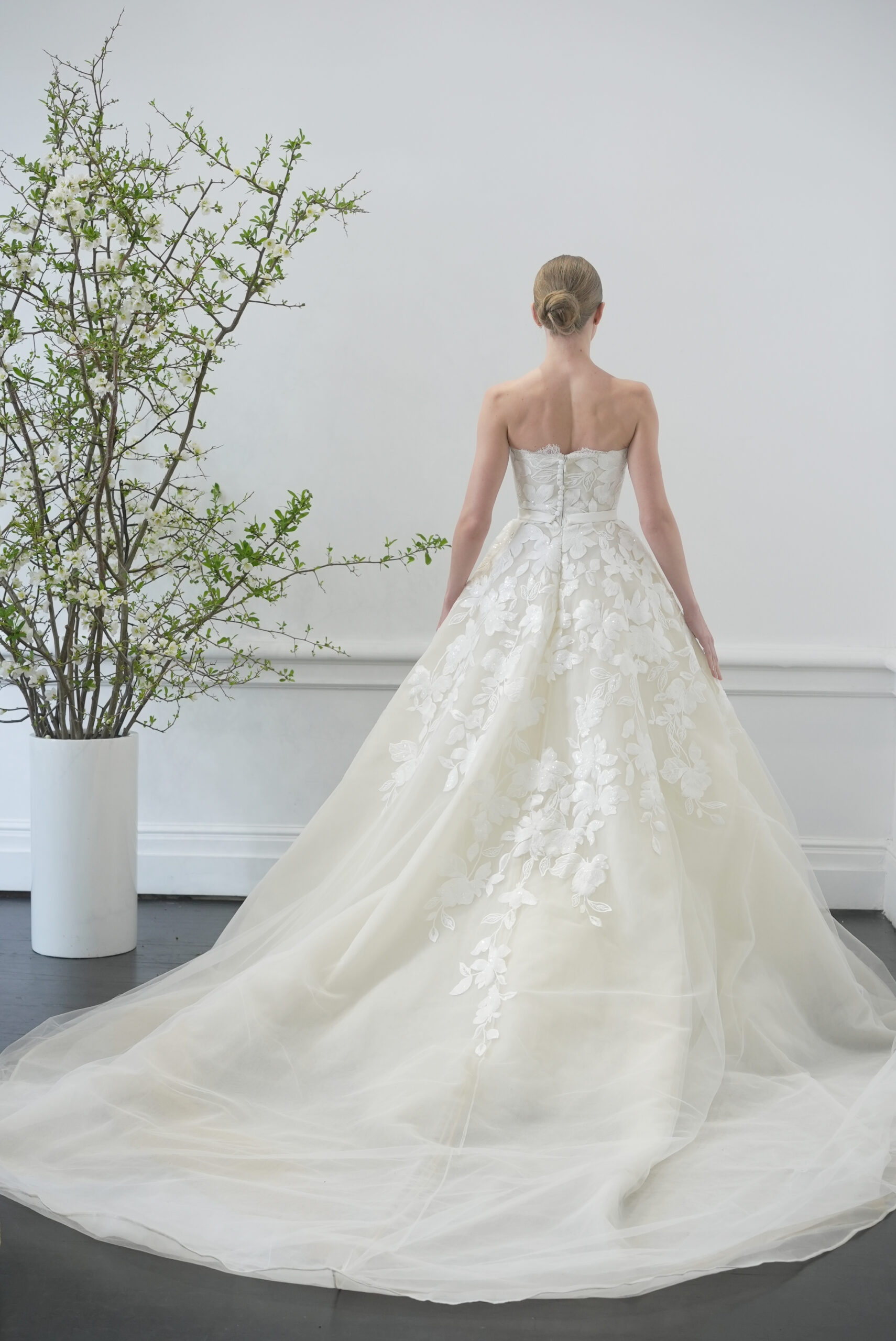 ストラップレスのチュールボールガウンは、ボディ全体に細やかな刺繍とスパンコールが施され、スカートへと優しく流れ落ちます。