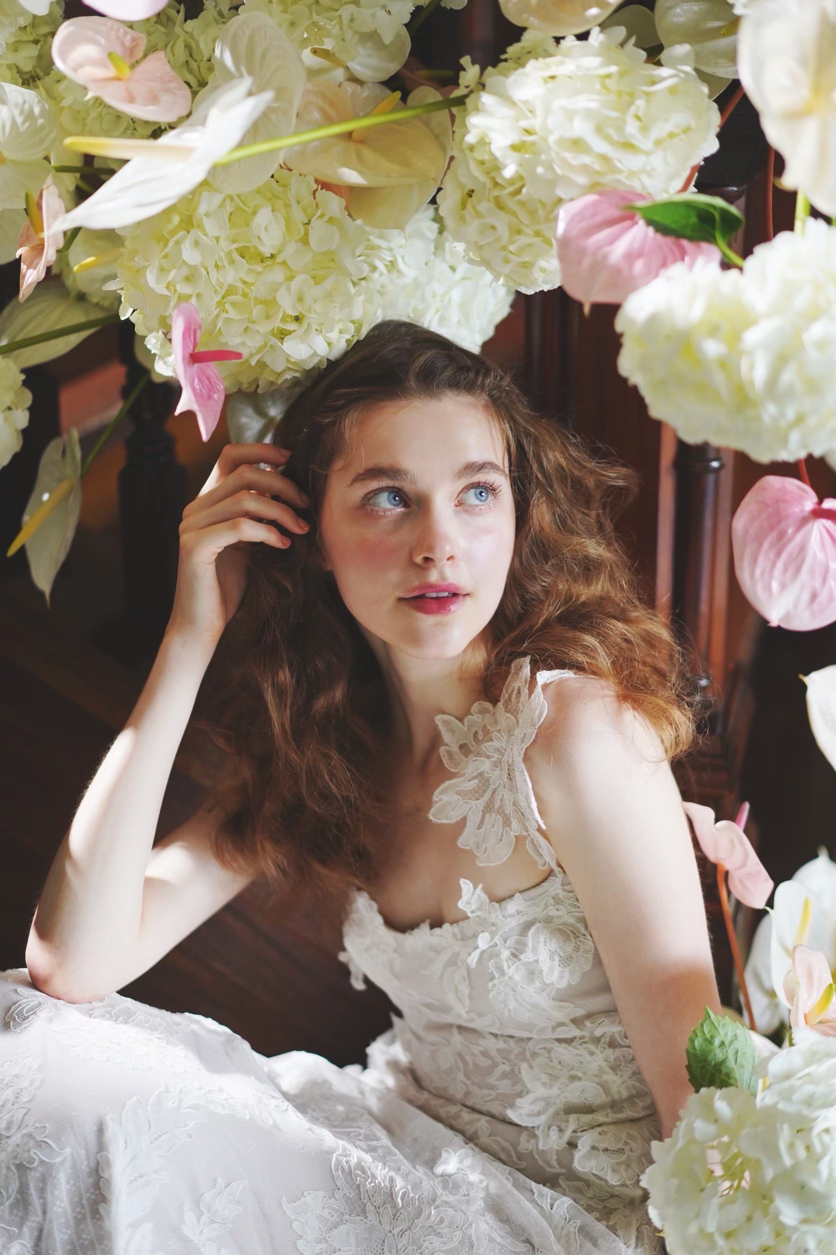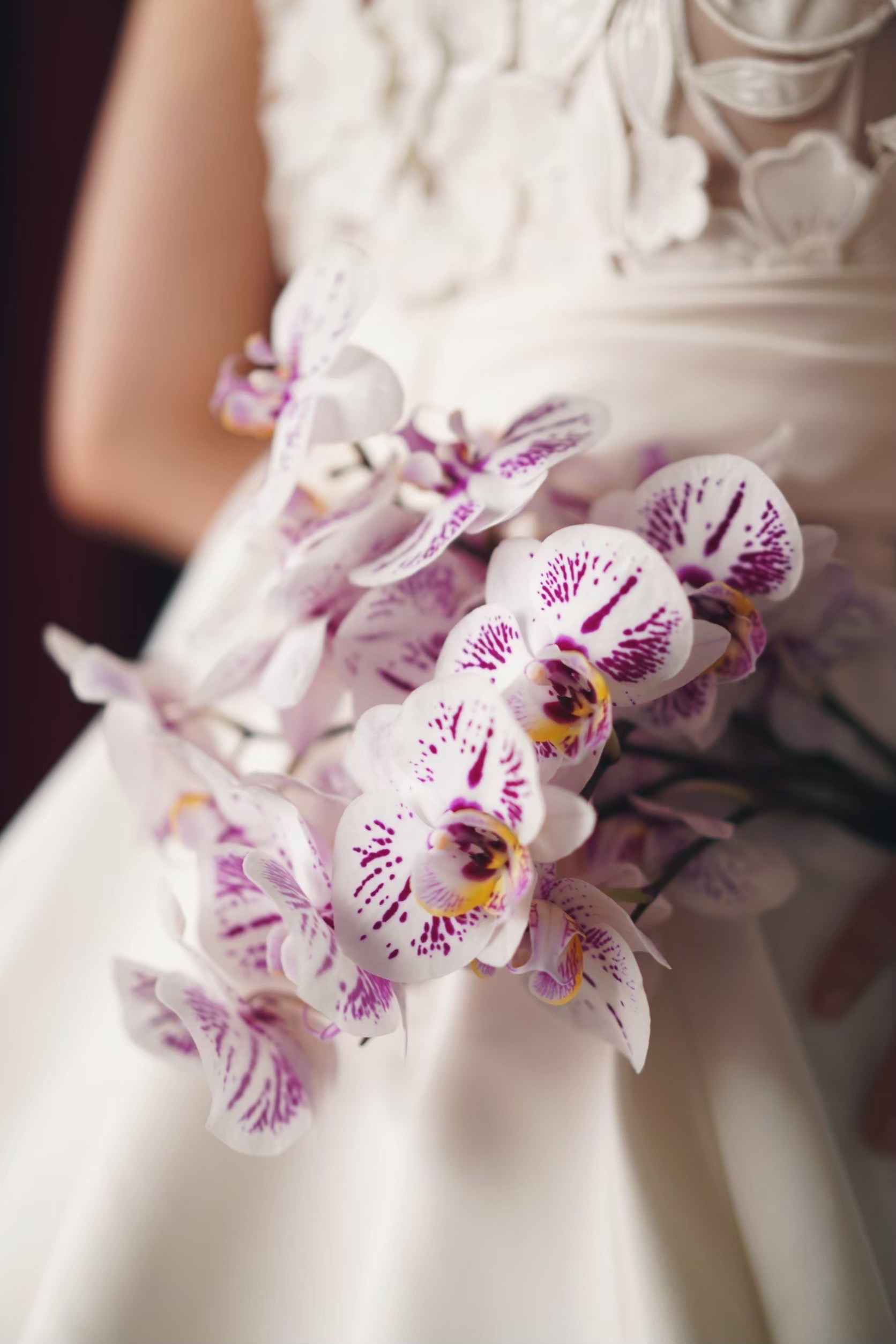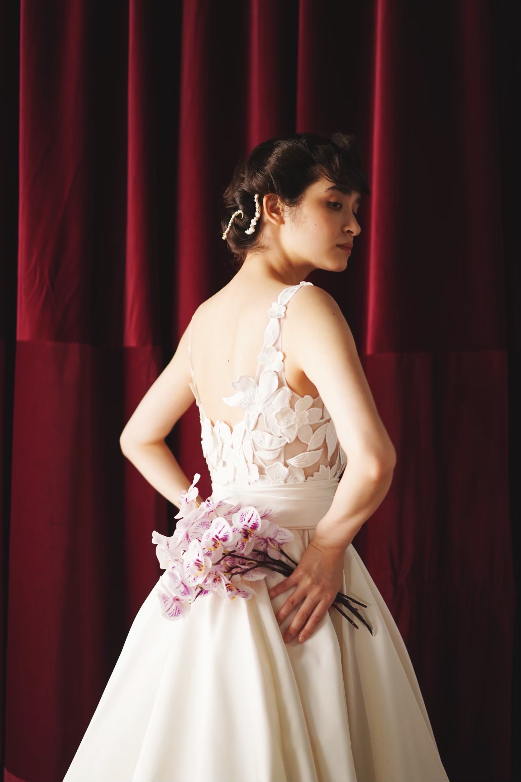 重厚感があり、クラシカルを極めたウェディングドレスはもちろん合いますが、TREATが提案したいのはどこか愛らしく、どこかモダンな抜け感を感じるブライズスタイル。洗練されているけれど、クラシカルすぎず、大人すぎない、そんなスタイルです。格別の美しさがありながらも、花嫁様に優しく溶け込む柔らかさもある。Oscar de la Renta(オスカー デ ラ レンタ)のウェディングドレスは、まさに私たちがお届けしたいスタイルを叶えてくれる一着です。上品にまとめたヘアスタイルには、ファッショナブルな遊び心を感じるヘッドアクセサリーを。手にはアートのような一輪の蘭の花を合わせ、バーガンディをモダンに纏います。タイムレスな美しさとモダンなエッセンスを絶妙なバランスで融合させたスタイリングに心くすぐられます。