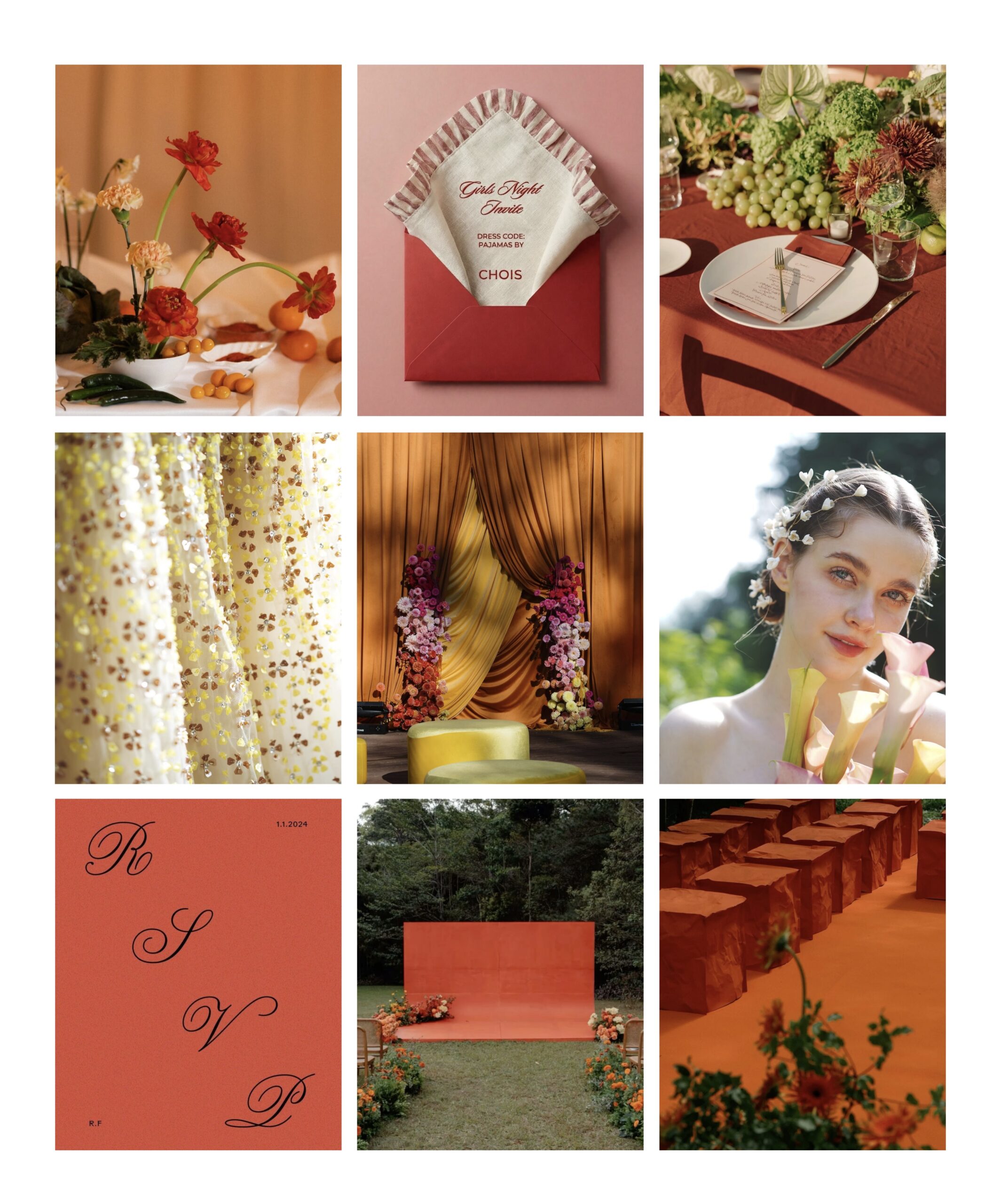 温かみがあり、生き生きとした印象を与えるオレンジ。同系色の花々やペーパーアイテムと組み合わせることで、さらにエネルギッシュで幸福感溢れる空間が生まれます。明るくジューシーで、華やかな色調のオレンジはウェディングだけでなく、ファッションの世界においても注目を集めるステートメントカラーです。