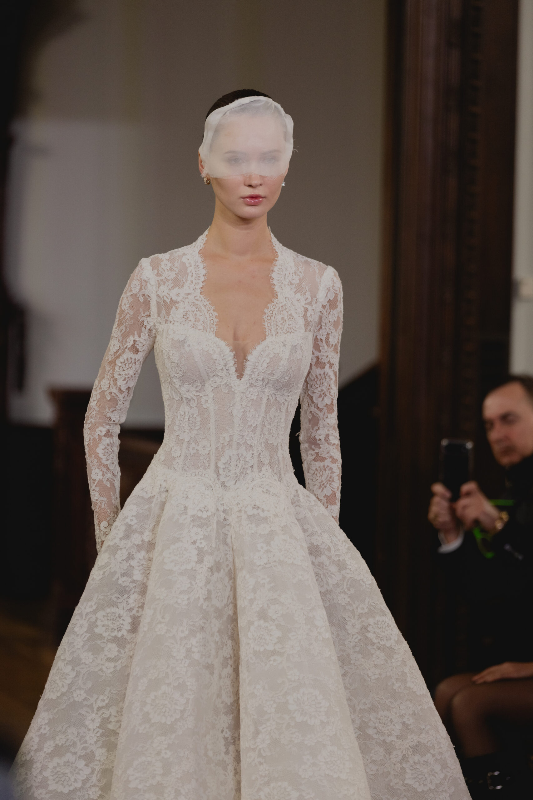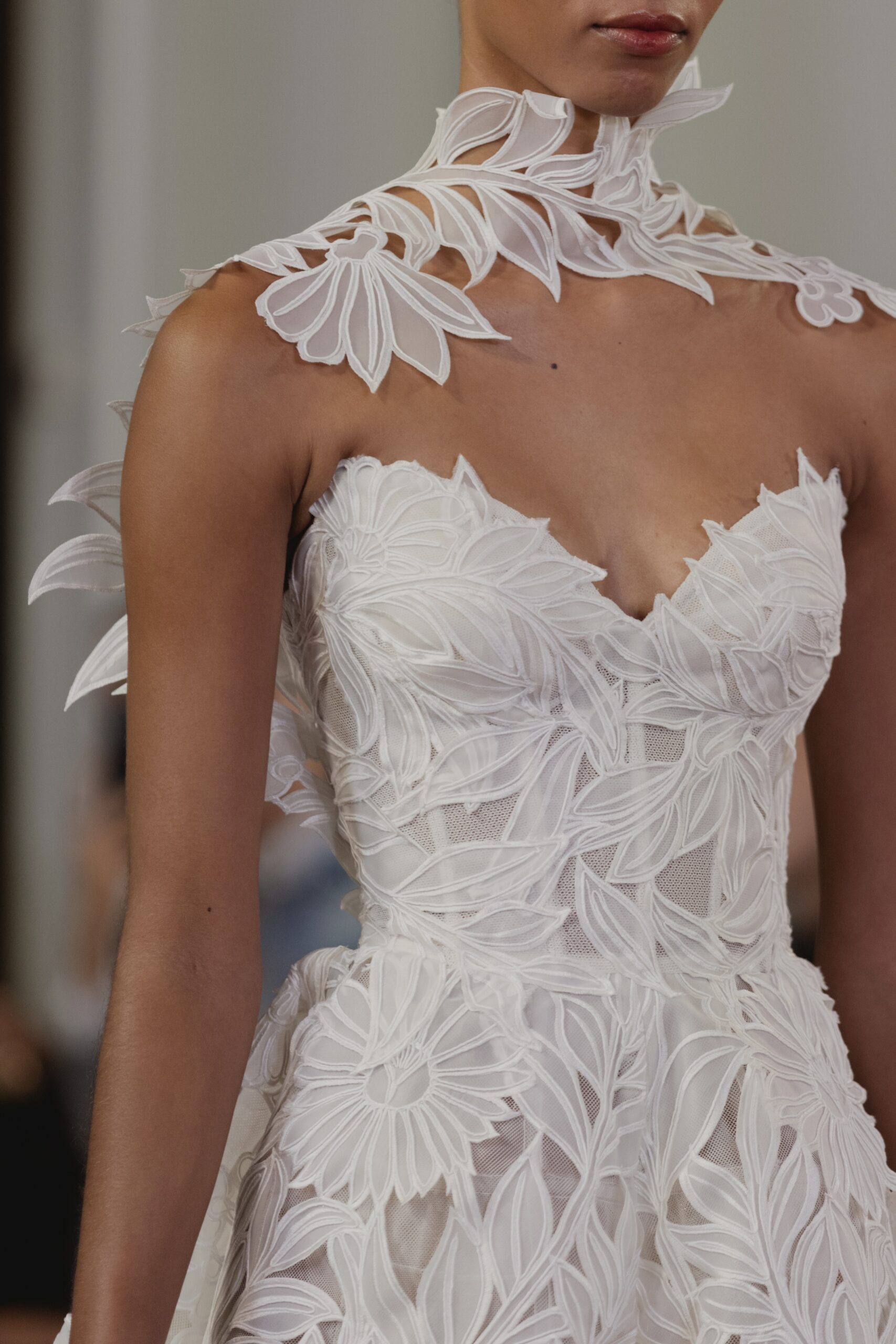 コレクションの中で一際目を引く一着は、柔らかく繊細なレースのディティールを最大限に生かした、究極にロマンティックな一着。