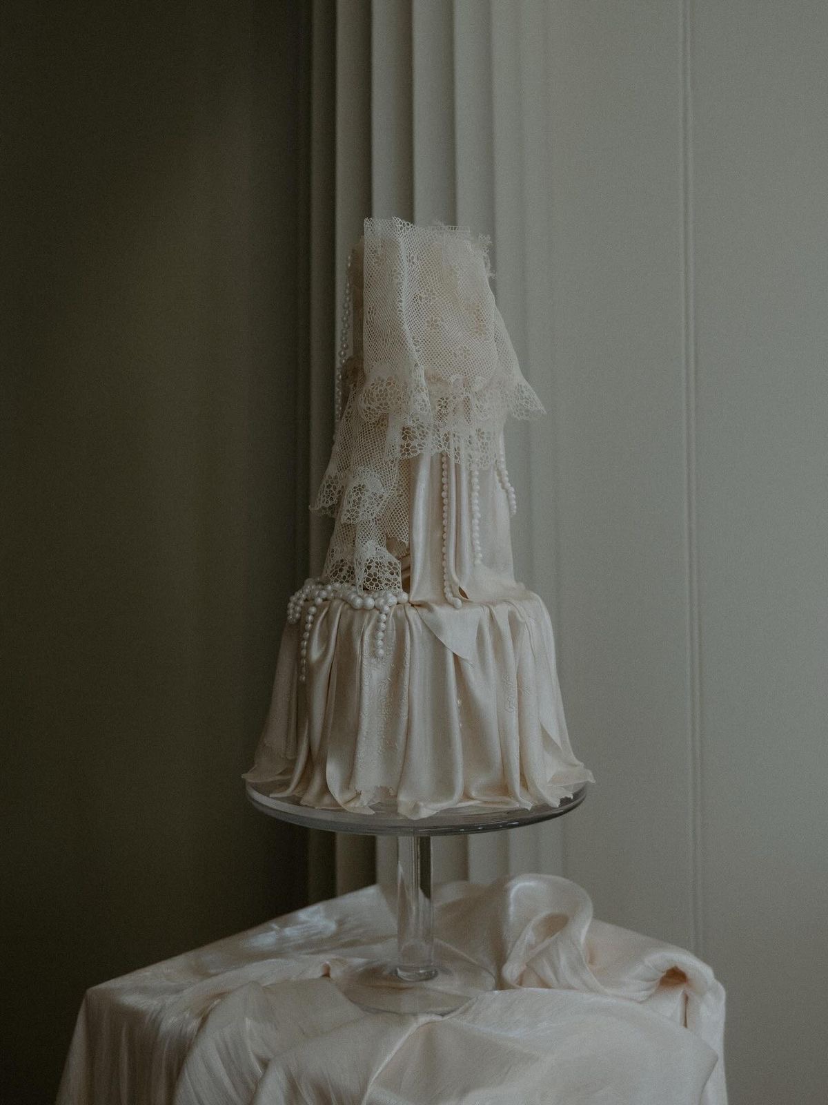 ネックスカーフは、花嫁にとって最もエレガントなアイテムの一つ。立体的で大胆なレースが鎖骨を美しくフレーミングします。顔まわりを華やかに飾る優雅なアクセントとなってくれます。