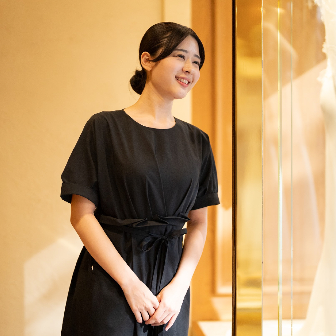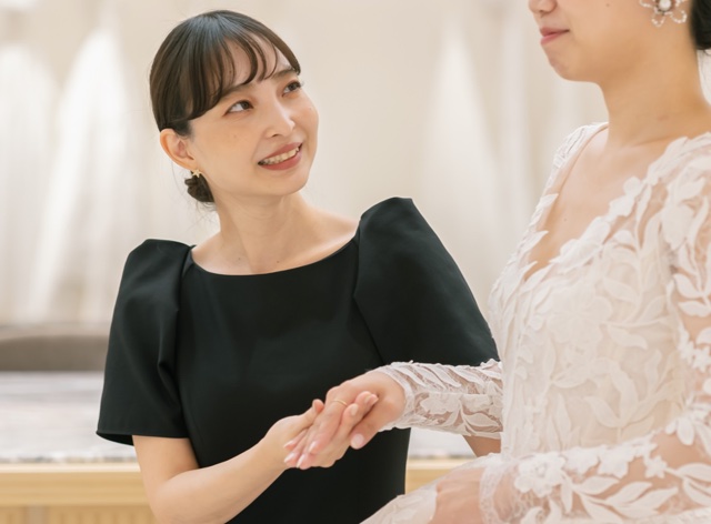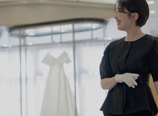 元々テーマパークのショースタッフをしていて、次回のオーディションまでのアルバイトとして応募したのですが、入社後、働いていく中でやりがいを感じ、トリートで働くことが大好きになりました。そして、私もドレスコーディネーターとしてトリートの良さをお客様にお伝えしたいと思うようになり、正社員へのステップアップを目指すことに決めました!自身のキャリアについて、親身になって相談にのってくれて、いっしょに頑張ろうと応援し、手を差し伸べてくれる周りのスタッフがたくさんいたことも、決意できた理由の1つになります。一生に一度のお手伝いをすることで、責任もあり思っていた以上に大変なこともありますが、それ以上にお客様のドレスをお召になっている時の笑顔をみていると、とても嬉しく、幸せな気持ちになれる素敵なお仕事です。