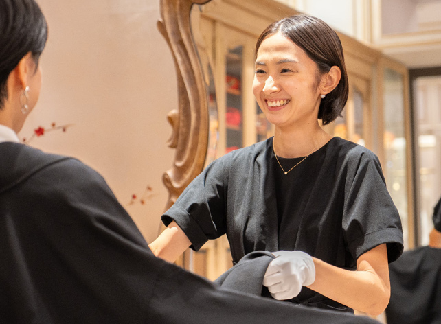 美容師アシスタントや、インテリアショップでのお仕事をしていましたが、通勤時に店舗の前を通って素敵なお店だなと思っていたトリートに入社しました。入社後、産休育休も取らせていただき、今は4才と2才の子供の育児中です。トリートは女性が9割の会社で、ママスタッフも多い為、お話しを共有できたり、子供の急な熱など理解をいただけたりと、ライフスタイルにあわせて働き方の提案や、一人ひとりを尊重してくれる会社だと感じています。私も出産前は週5日フルタイムでお仕事をしていましたが、復帰後は今の働き方をさせてもらっています。また、アルバイトスタッフも目標設定をしたり、女性としても素敵なスタッフばかりなので、自分もがんばらないと!といくつになっても成長できる環境があります。現在、モーニングや留袖の接客もさせていただいていますが、元々人と会話することが好きで接客も好きなので、楽しいです!家だと小さい子供と話しているので、お仕事でたくさんのお客様やスタッフとお話しできることは、オンオフの切り替えもでき、自身のライフワークバランスにマッチしていると思っています。今後も家庭も大事にしながら、働いていきたいと思っています。
