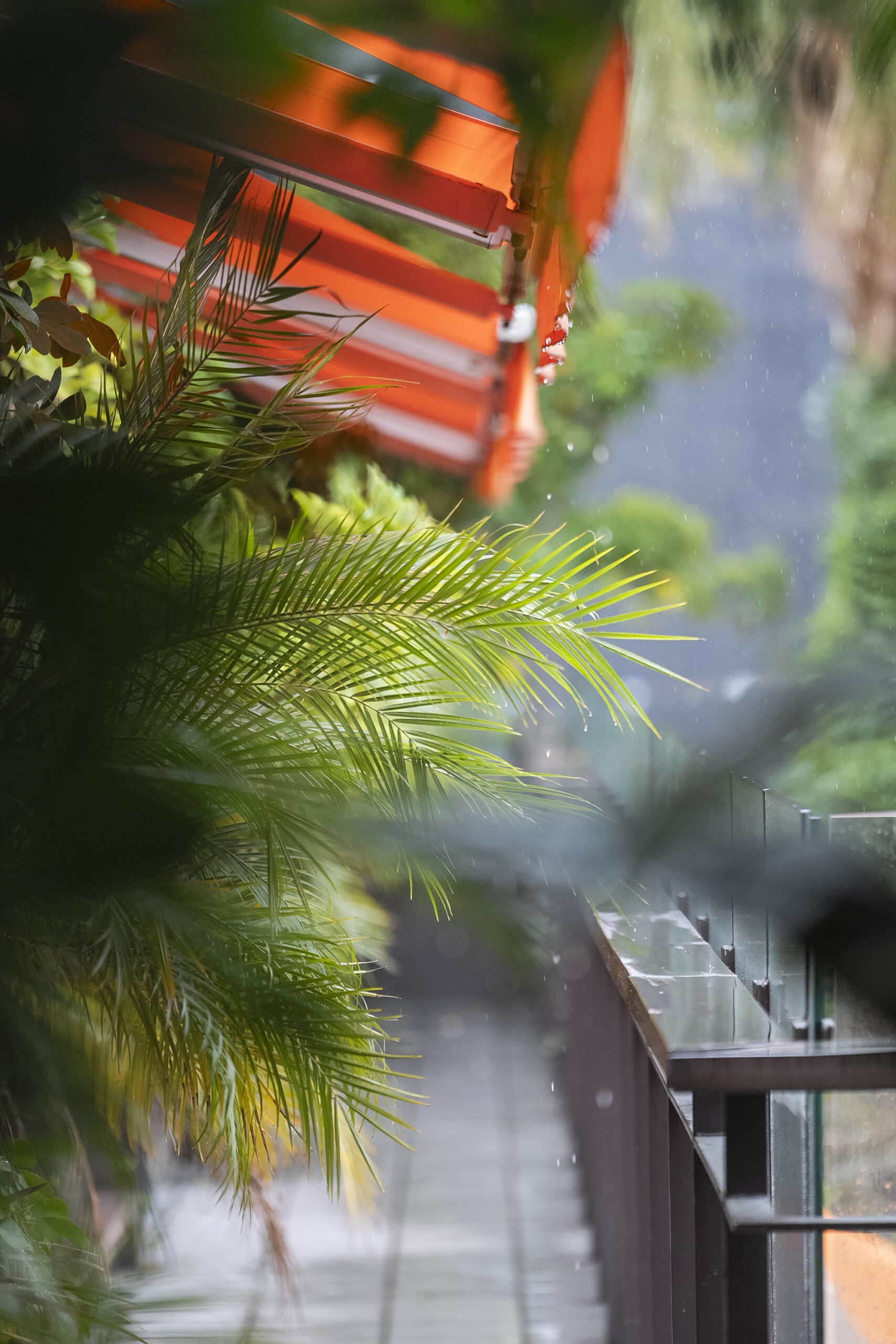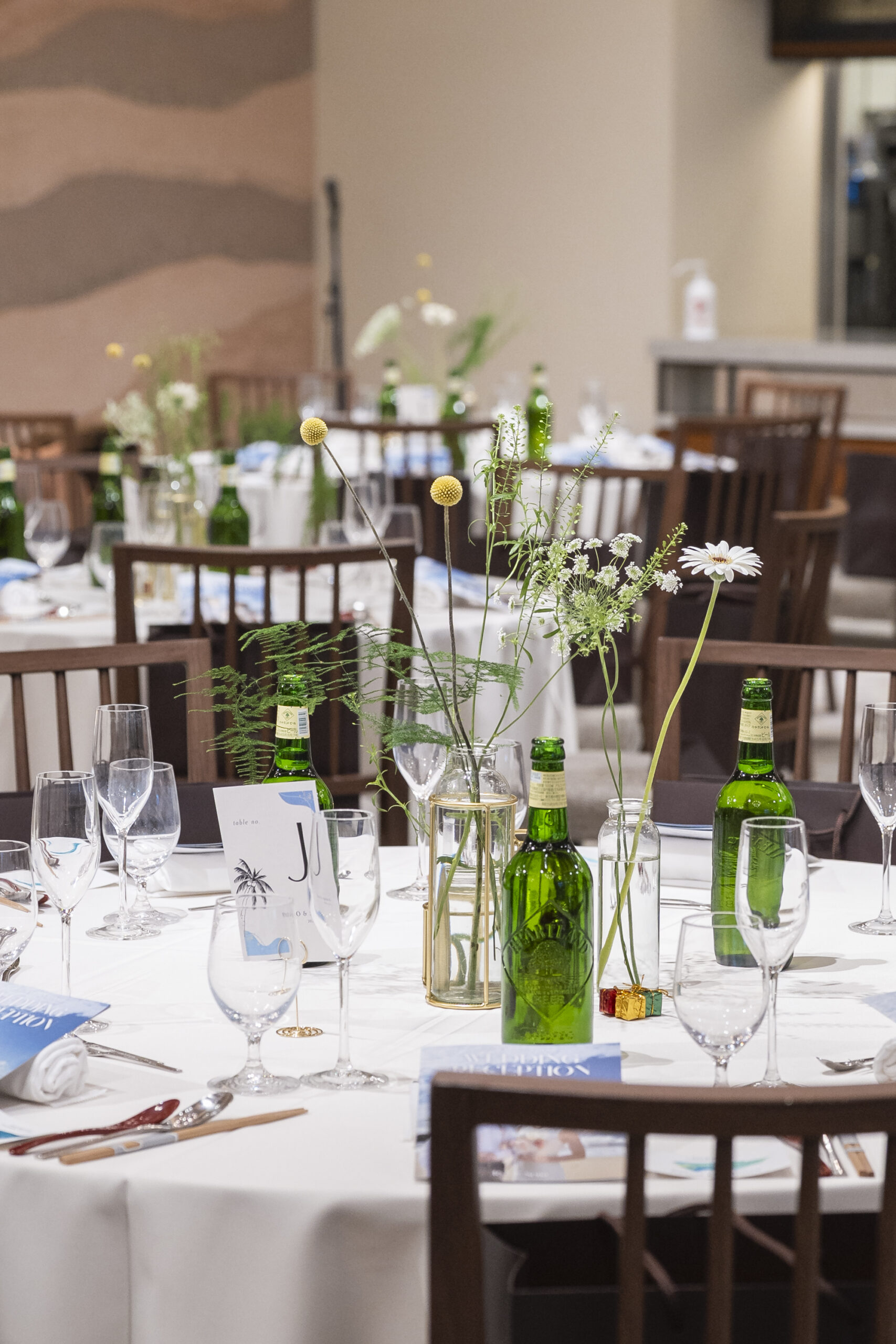 木目や石壁が魅力の披露宴会場に赤の色味が映え、