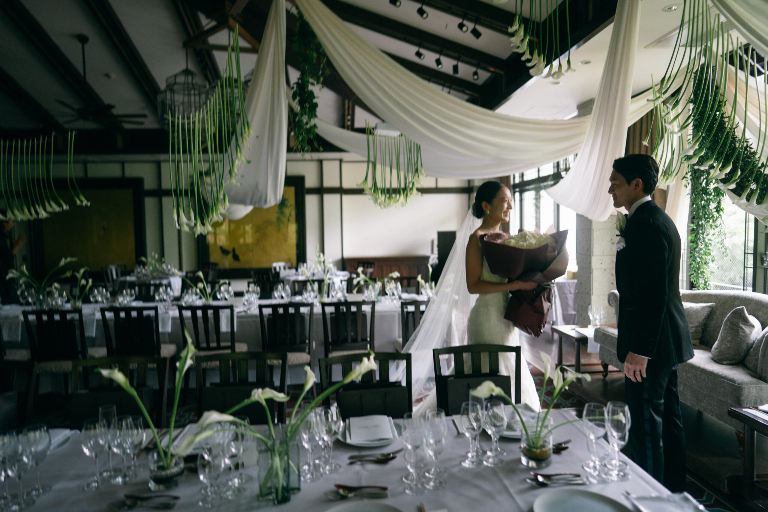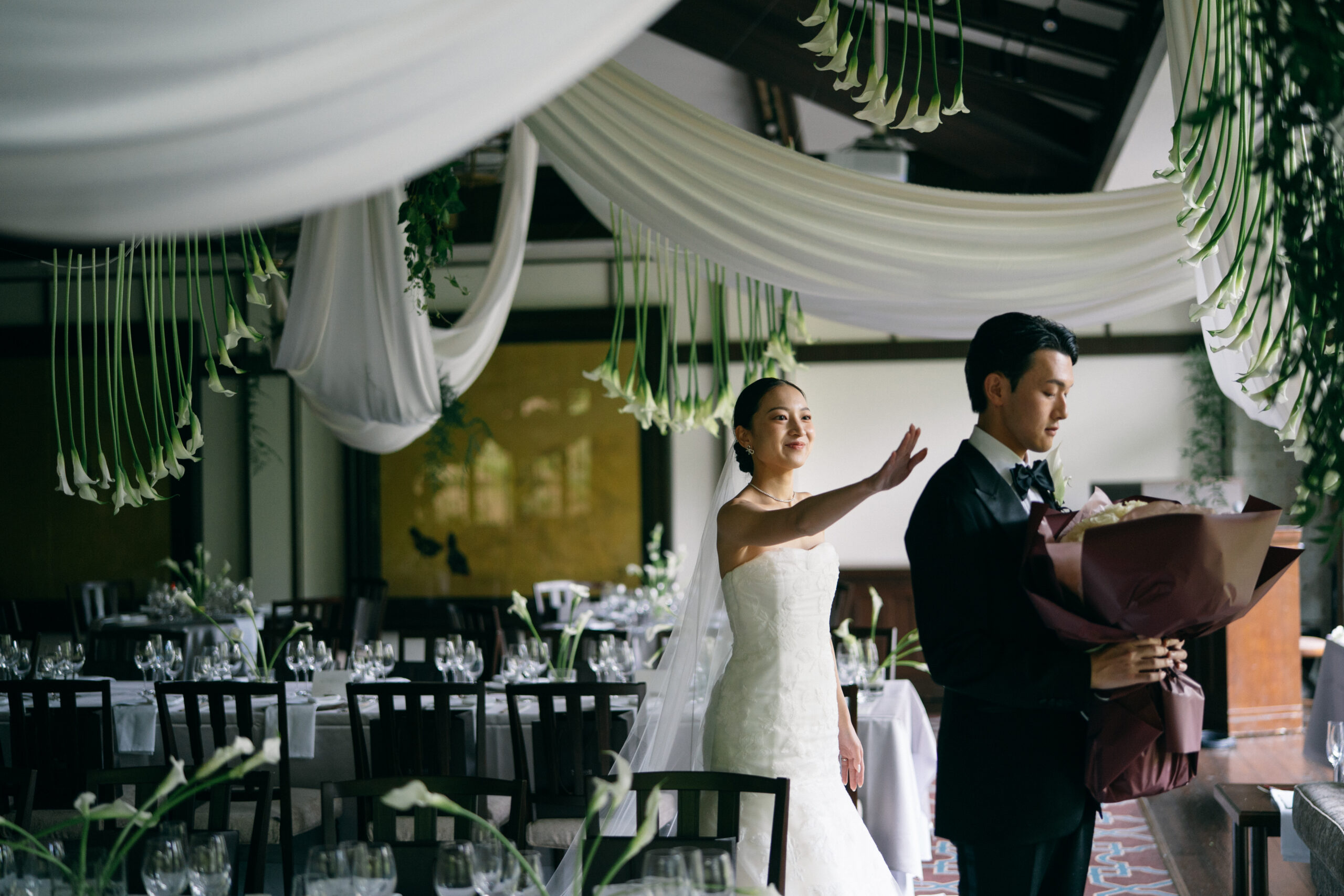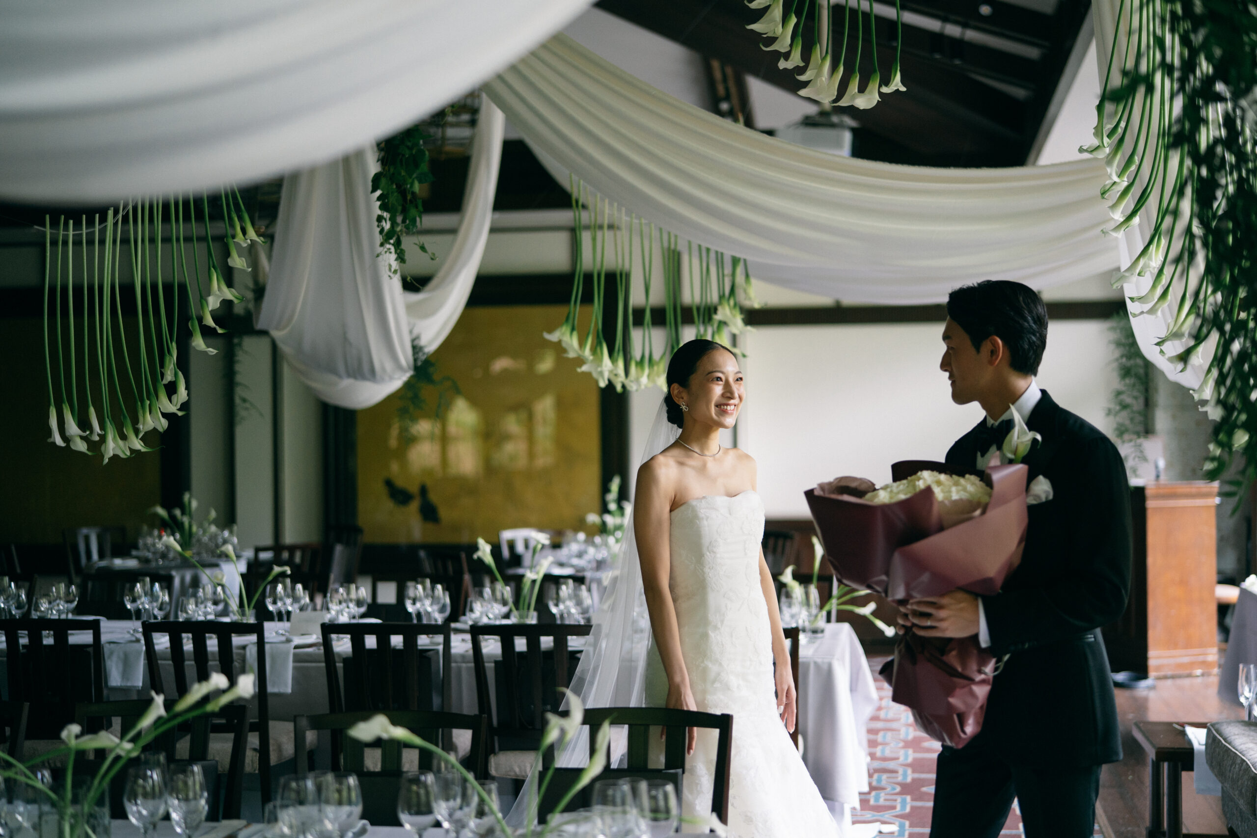 上質でシックさが息づく会場に、佇むお二人はまるでカラーのお花に包み込まれたかのよう。