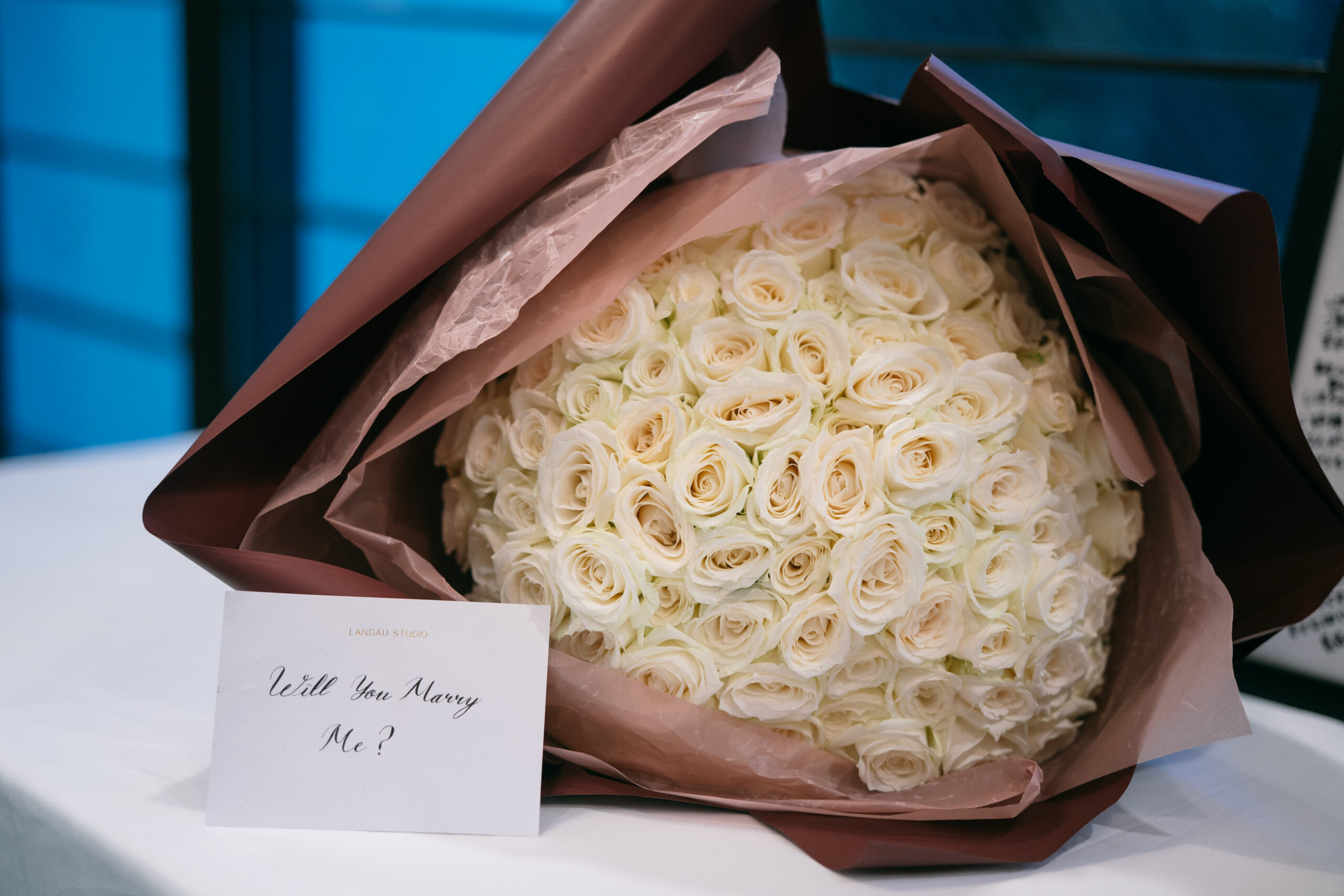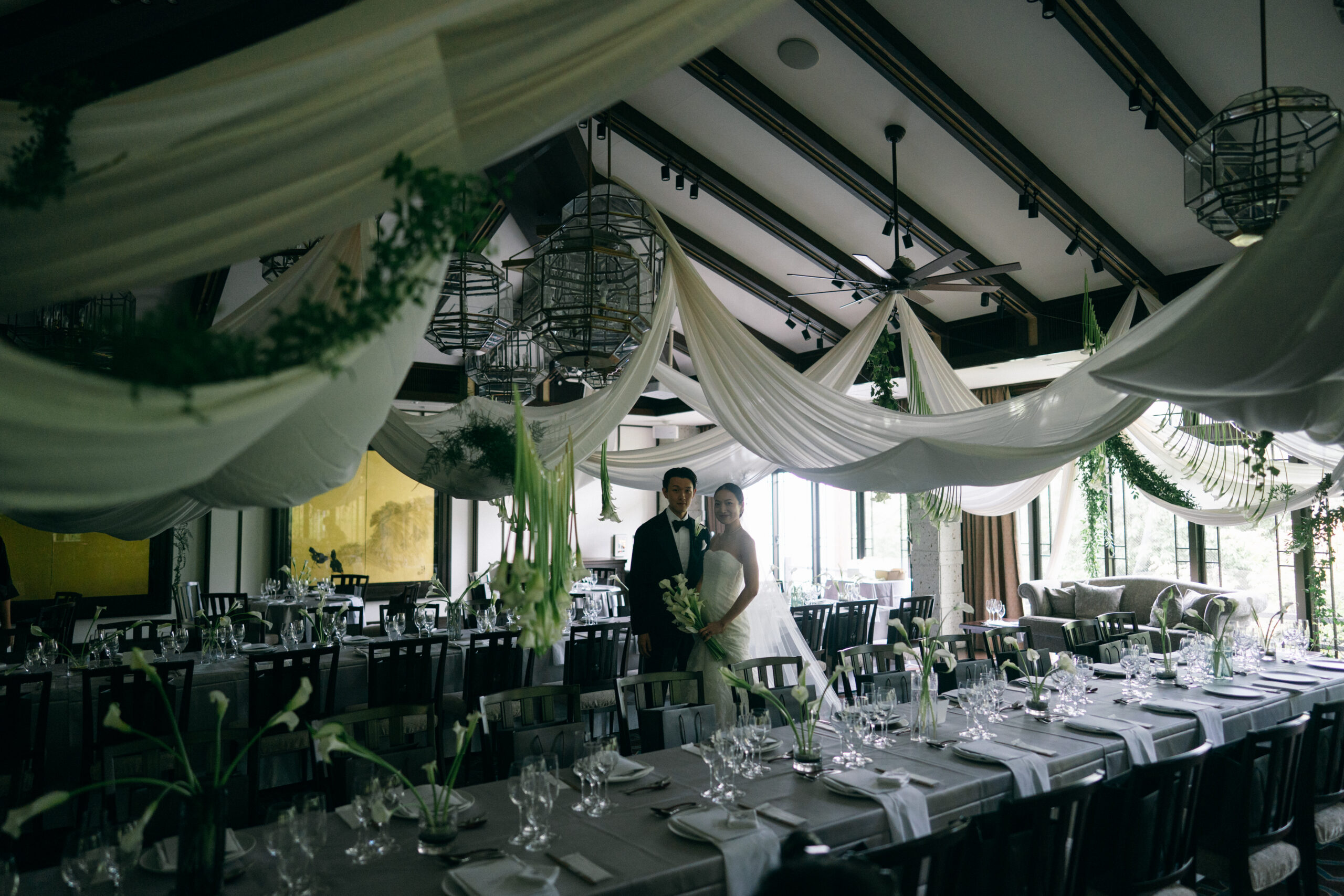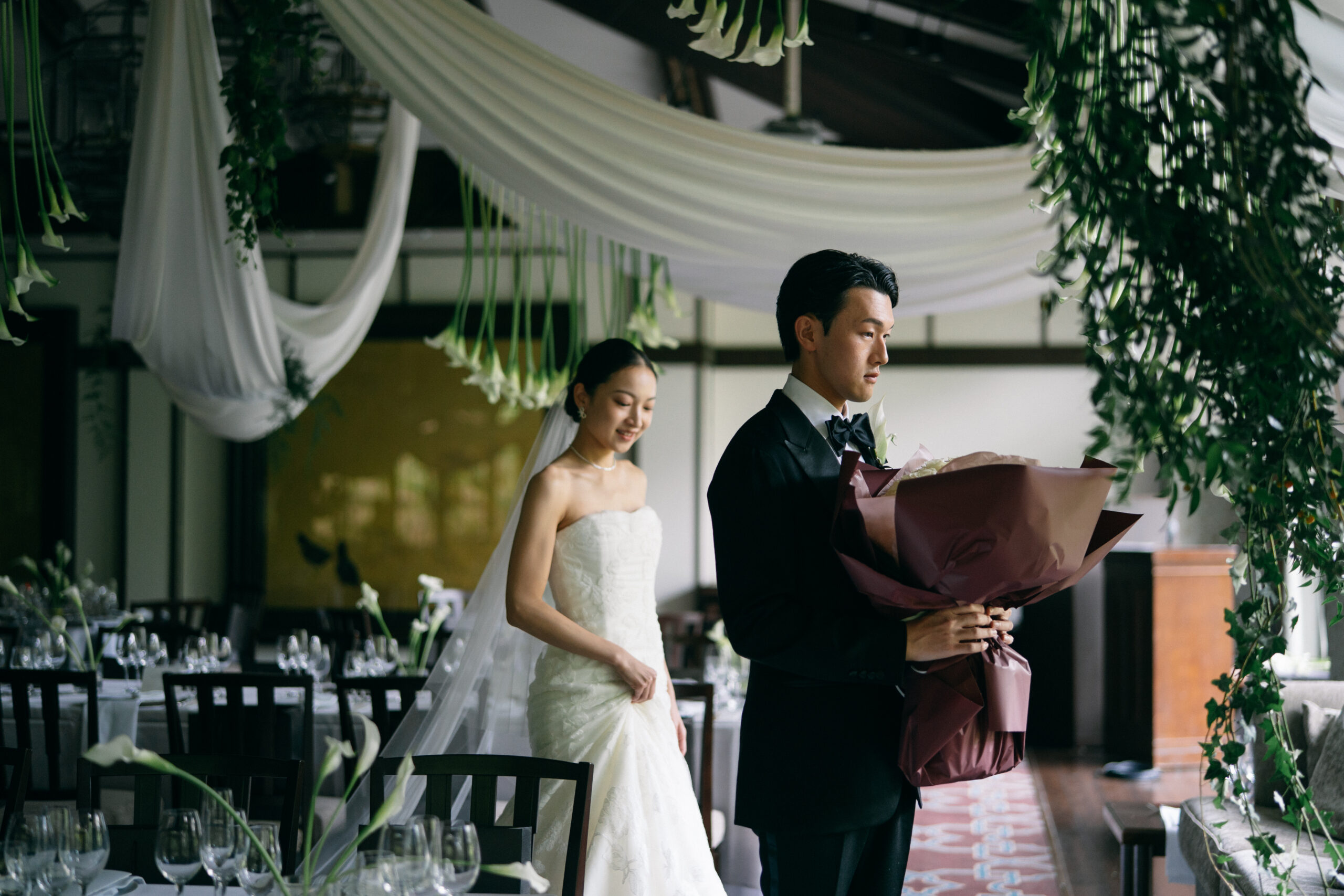 上質でシックさが息づく会場に、佇むお二人はまるでカラーのお花に包み込まれたかのよう。