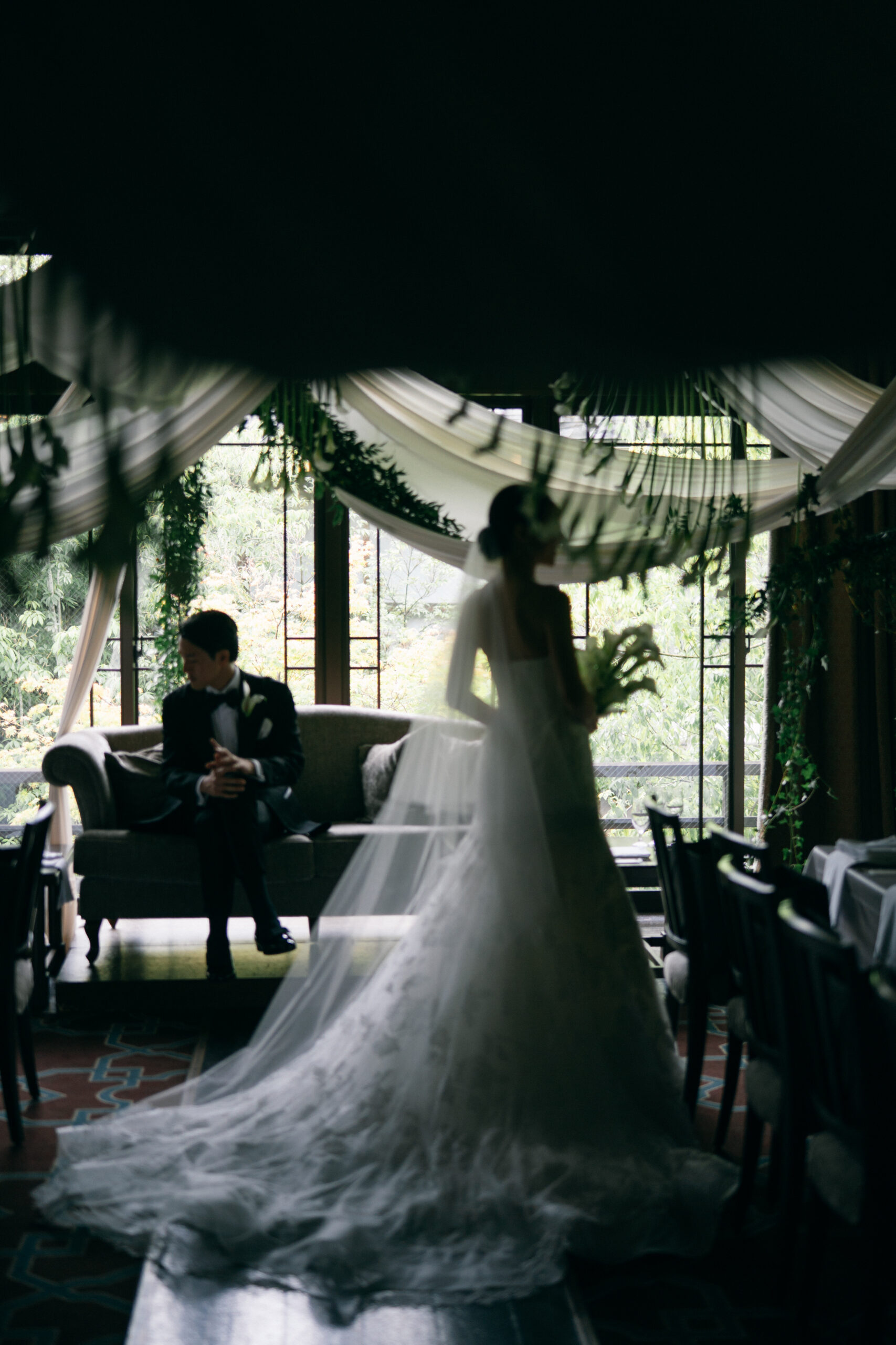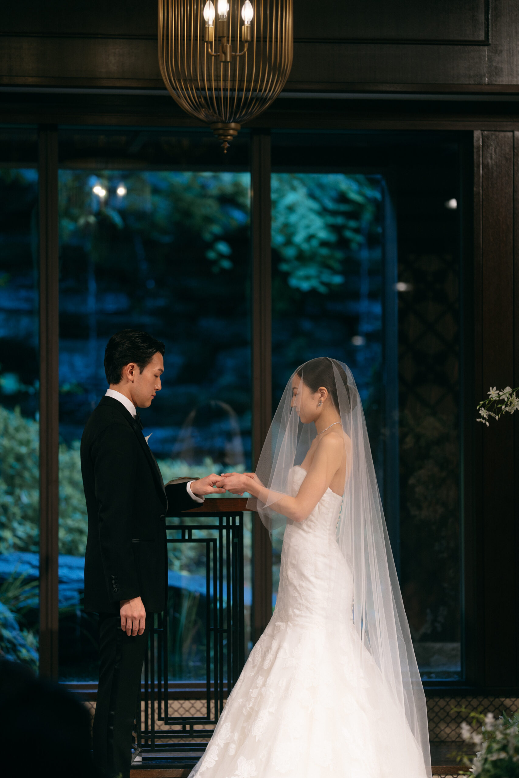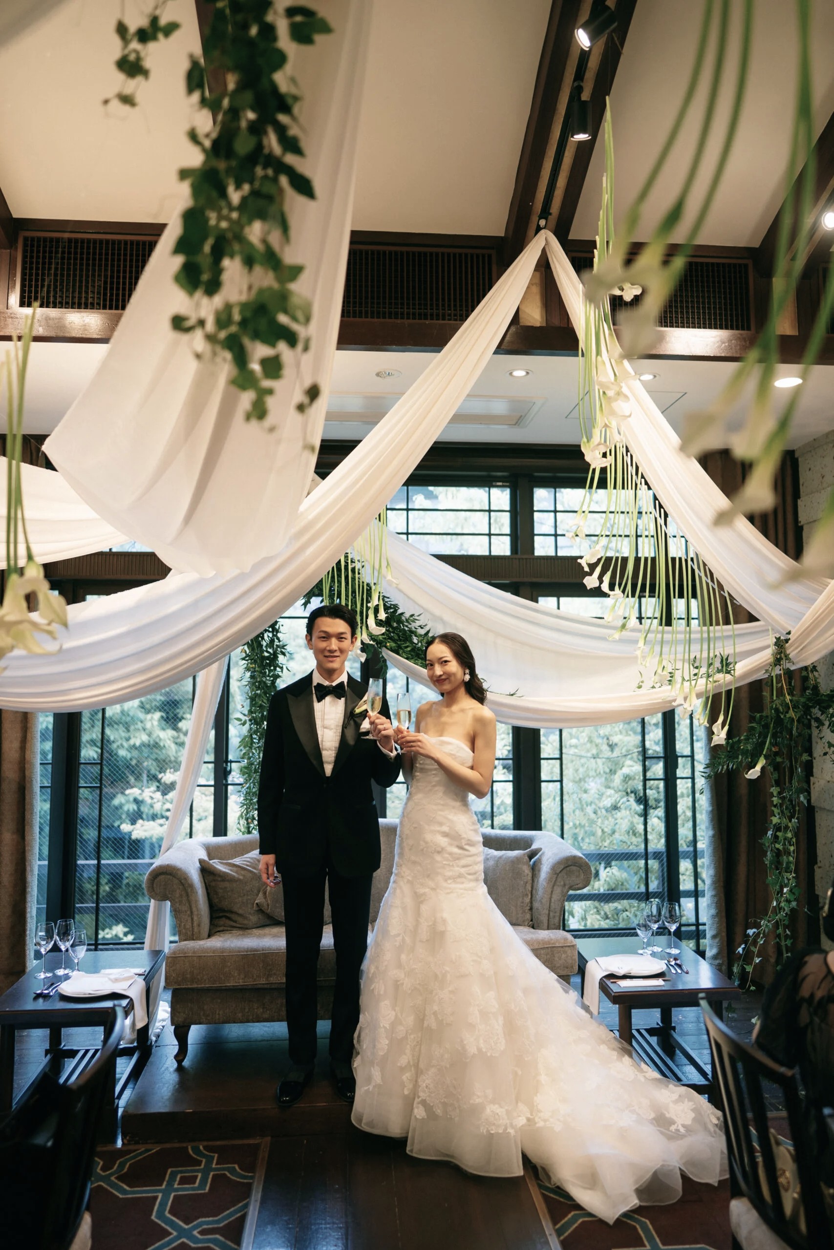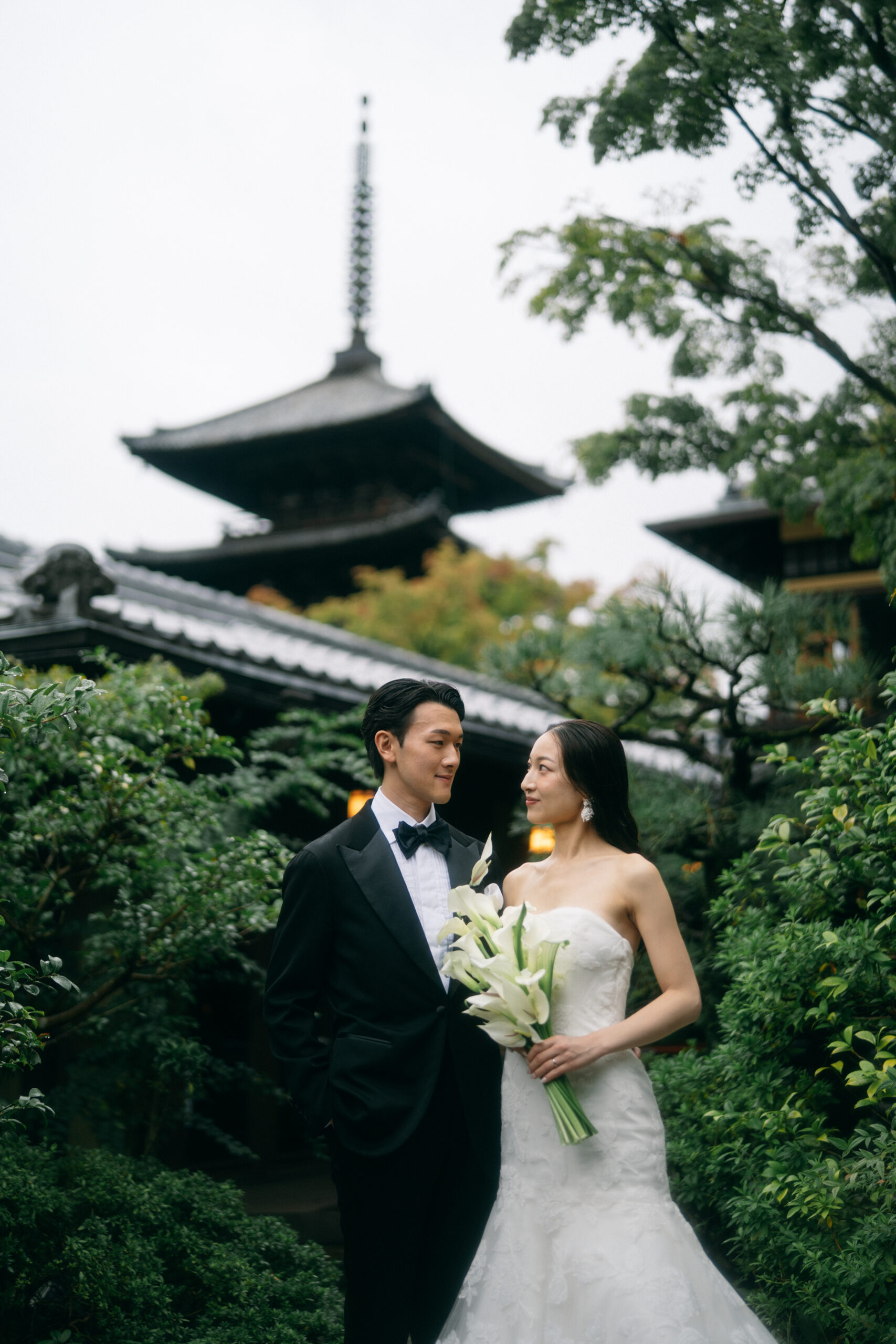 ザソウドウ東山京都でトリートのレースのマーメイドドレスを着た花嫁とブラックのタキシードを着た新郎様。