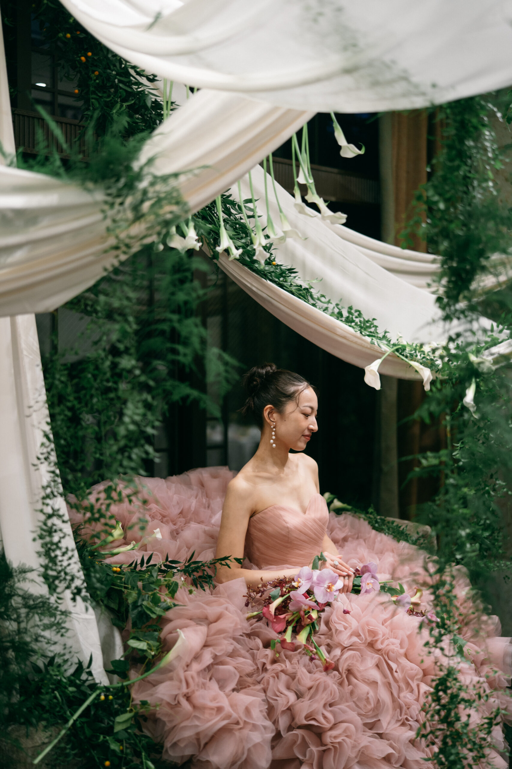ウェディングドレスのエレガントで凛とした雰囲気から一変し、満開のお花が咲き誇るような華やかさに。