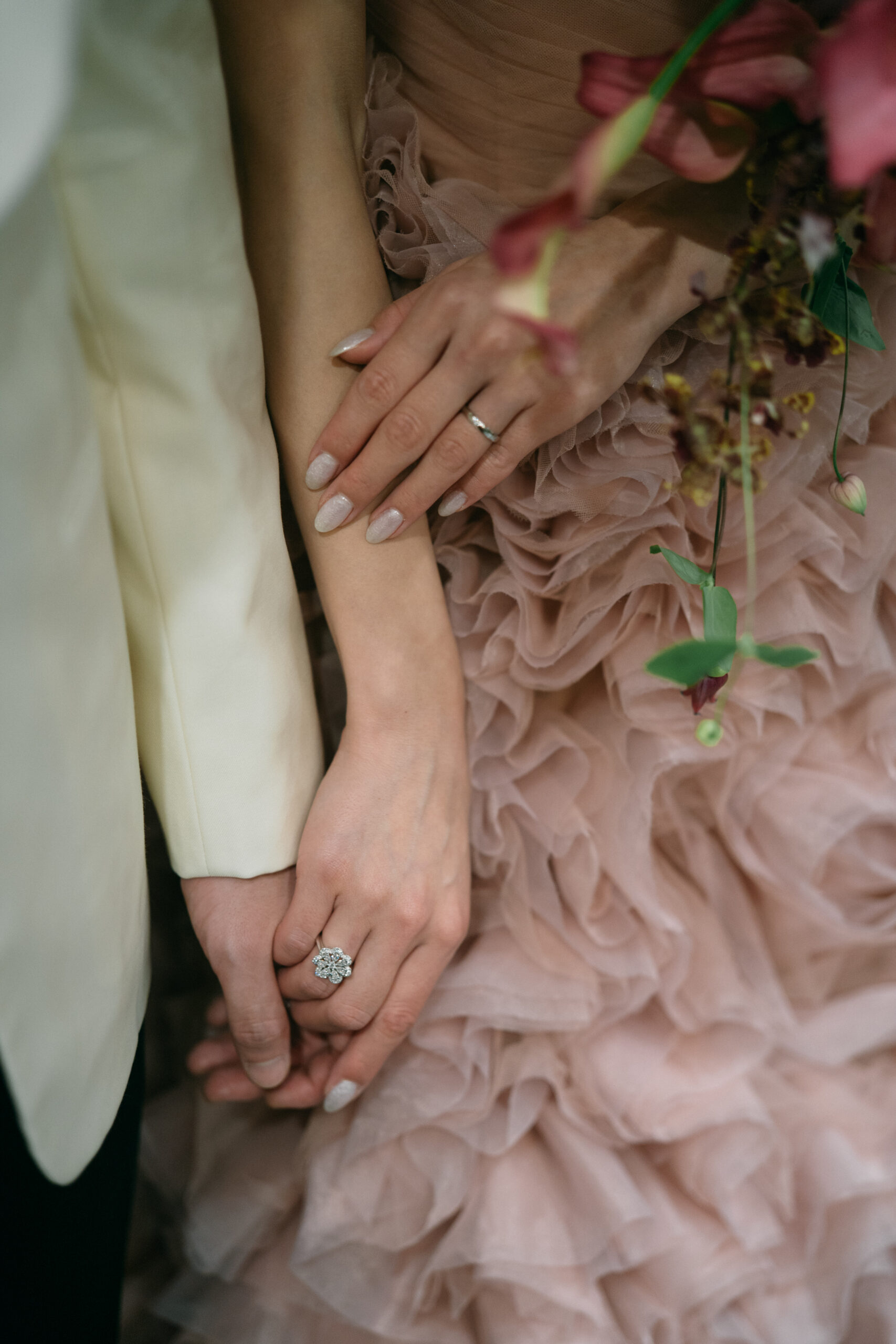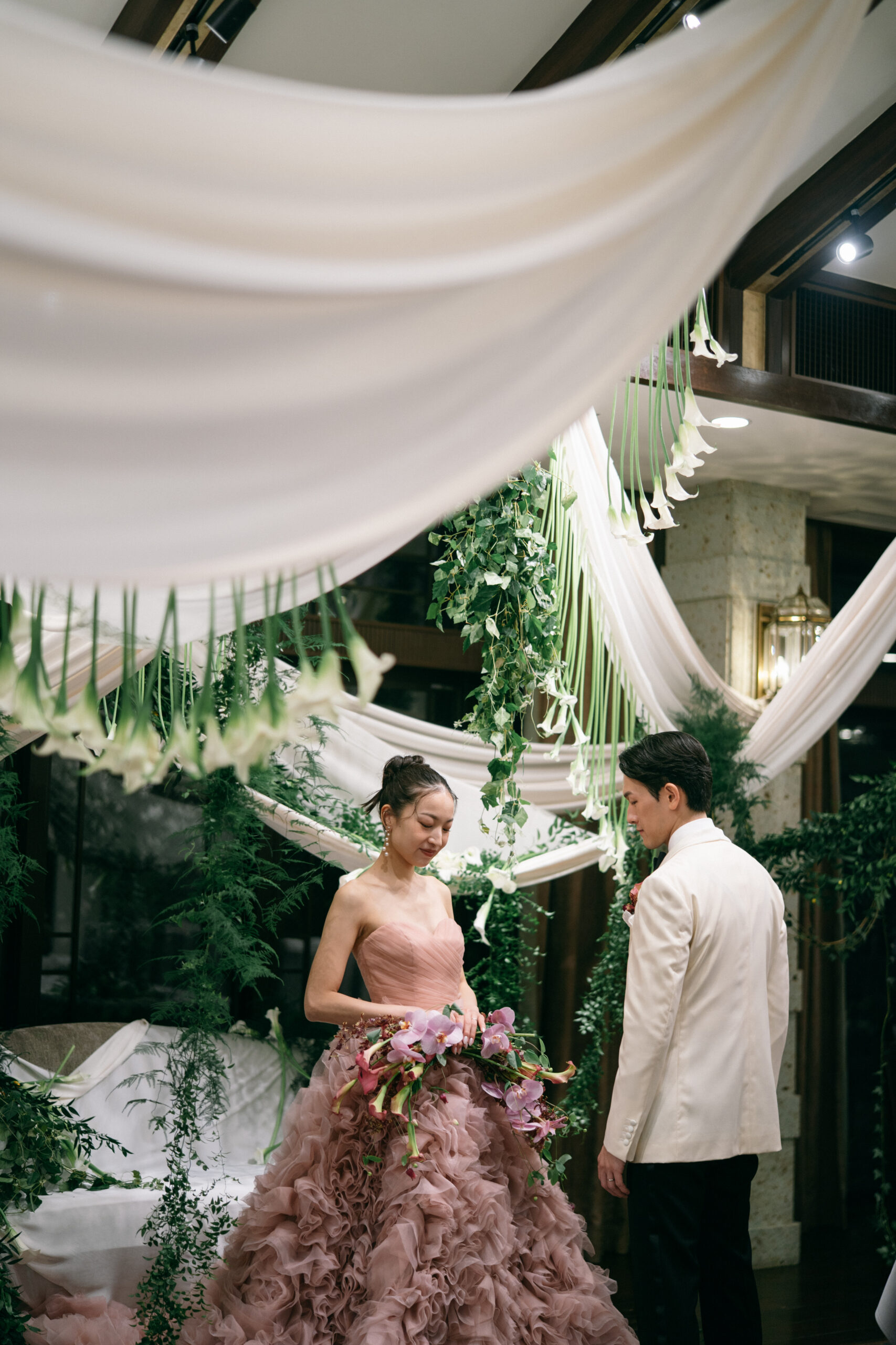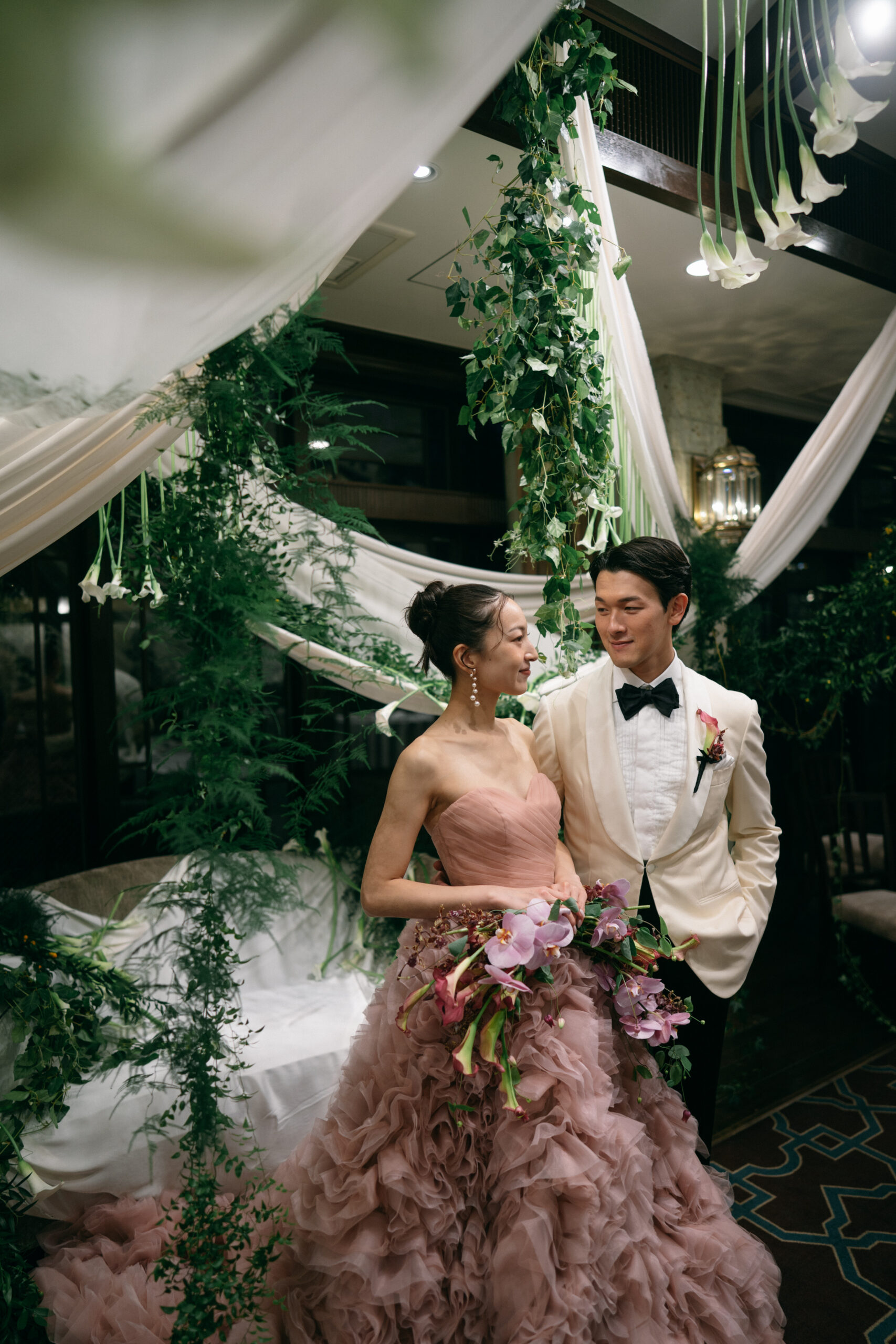 くすみピンクのカラードレスとホワイトのタキシードスタイリングは、互いを引き立て合うようにコントラストが美しいです。