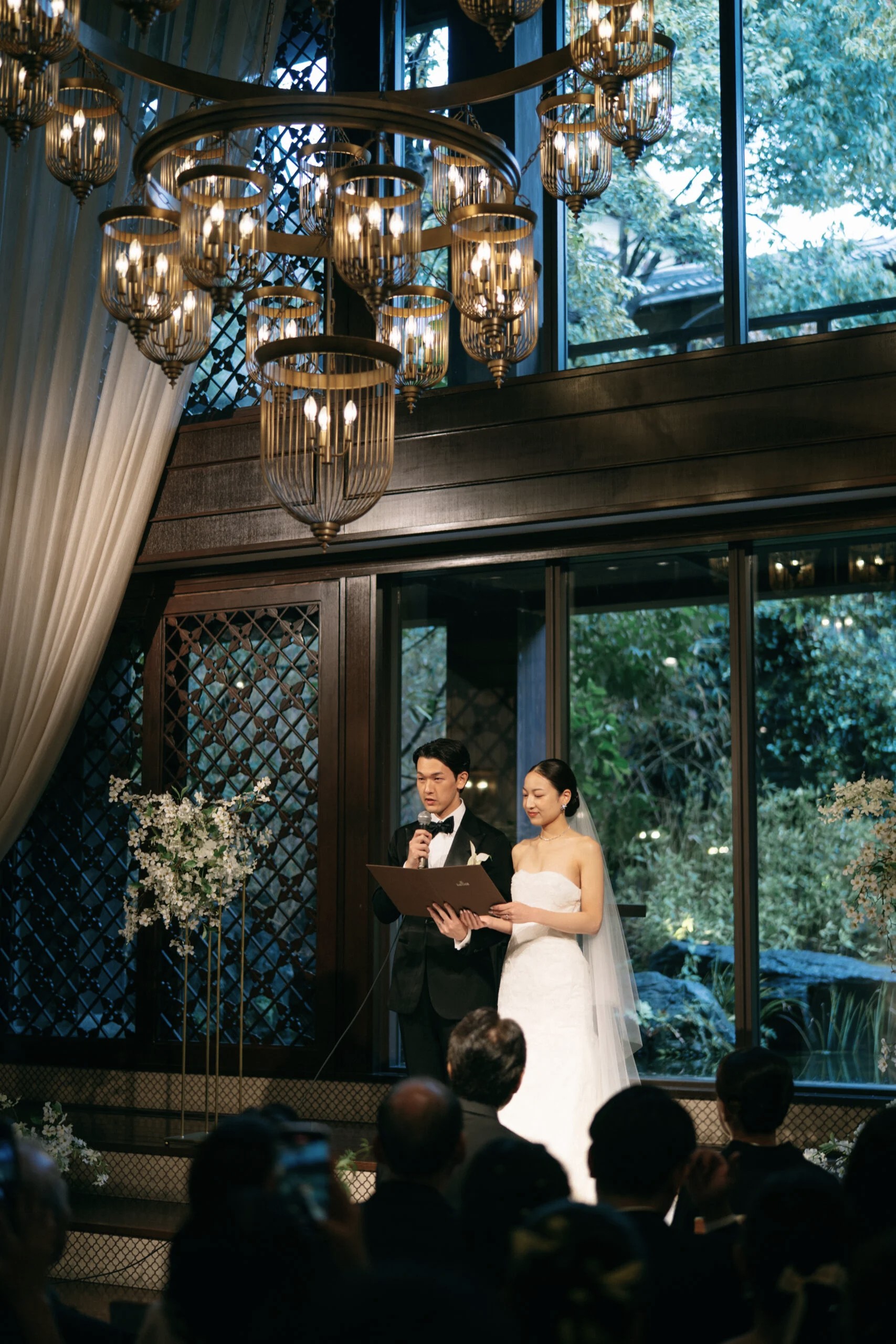 挙式は祭壇の向こうに流れる滝の水音、風になびく青葉、季節の花々を感じながら、優しく包みこむように柔らかな太陽の光が差し込み、まるでお二人を祝福しているかのような甘美な雰囲気に。