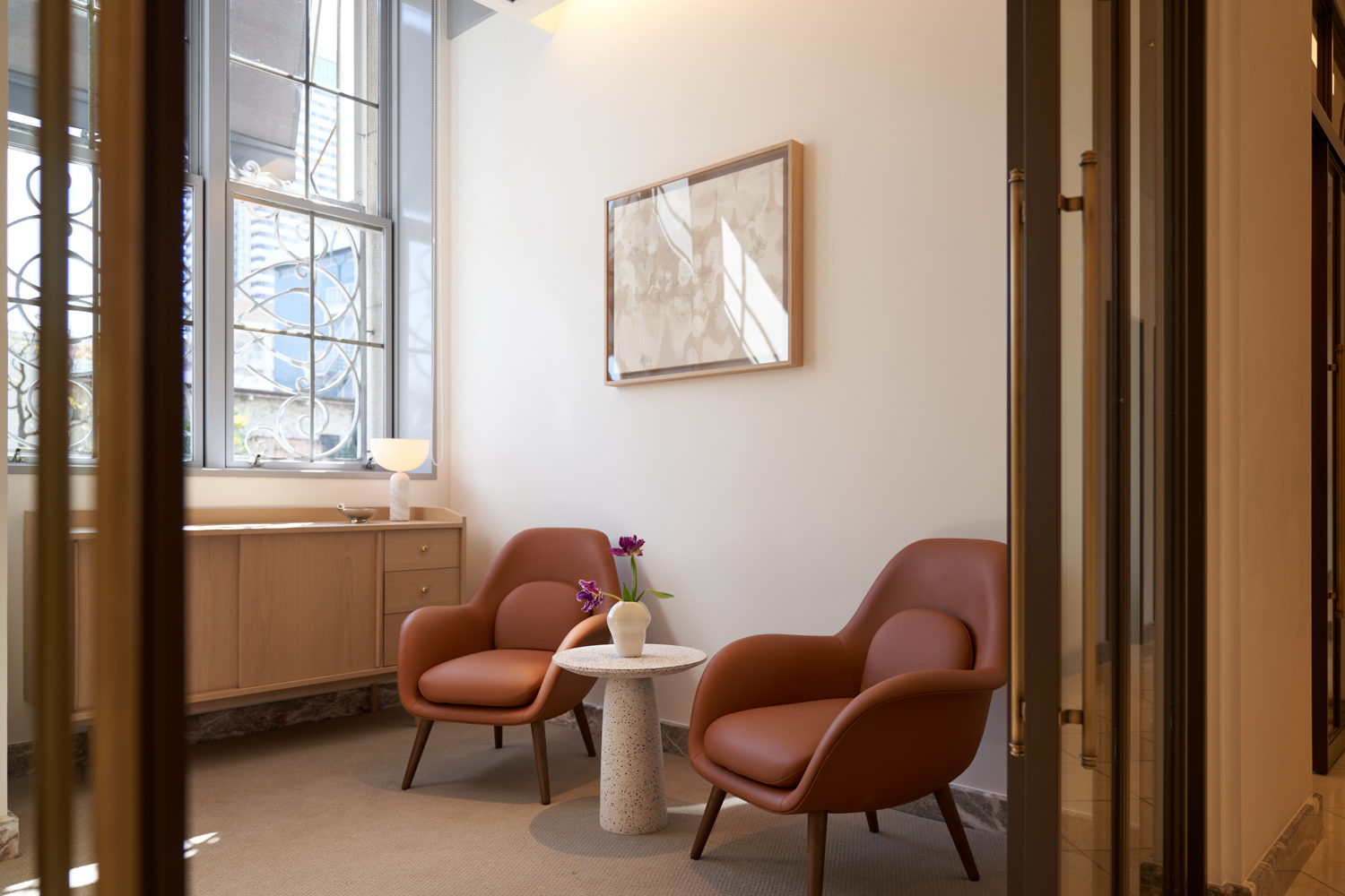 メリケンパークよりほど近い、石造りの重厚感あふれる建造物が立ち並ぶ海岸通り沿いに佇む「神戸メリケンビル」。一歩足を踏み入れた瞬間ラグジュアリーでありながらも開放感あふれる独立型のレセプション。ひとつひとつこだわりぬいたヨーロッパブランド家具や日本人女性が手がける現代アートは、モダンさとほんの少しのコンテンポラリーさを感じられます。