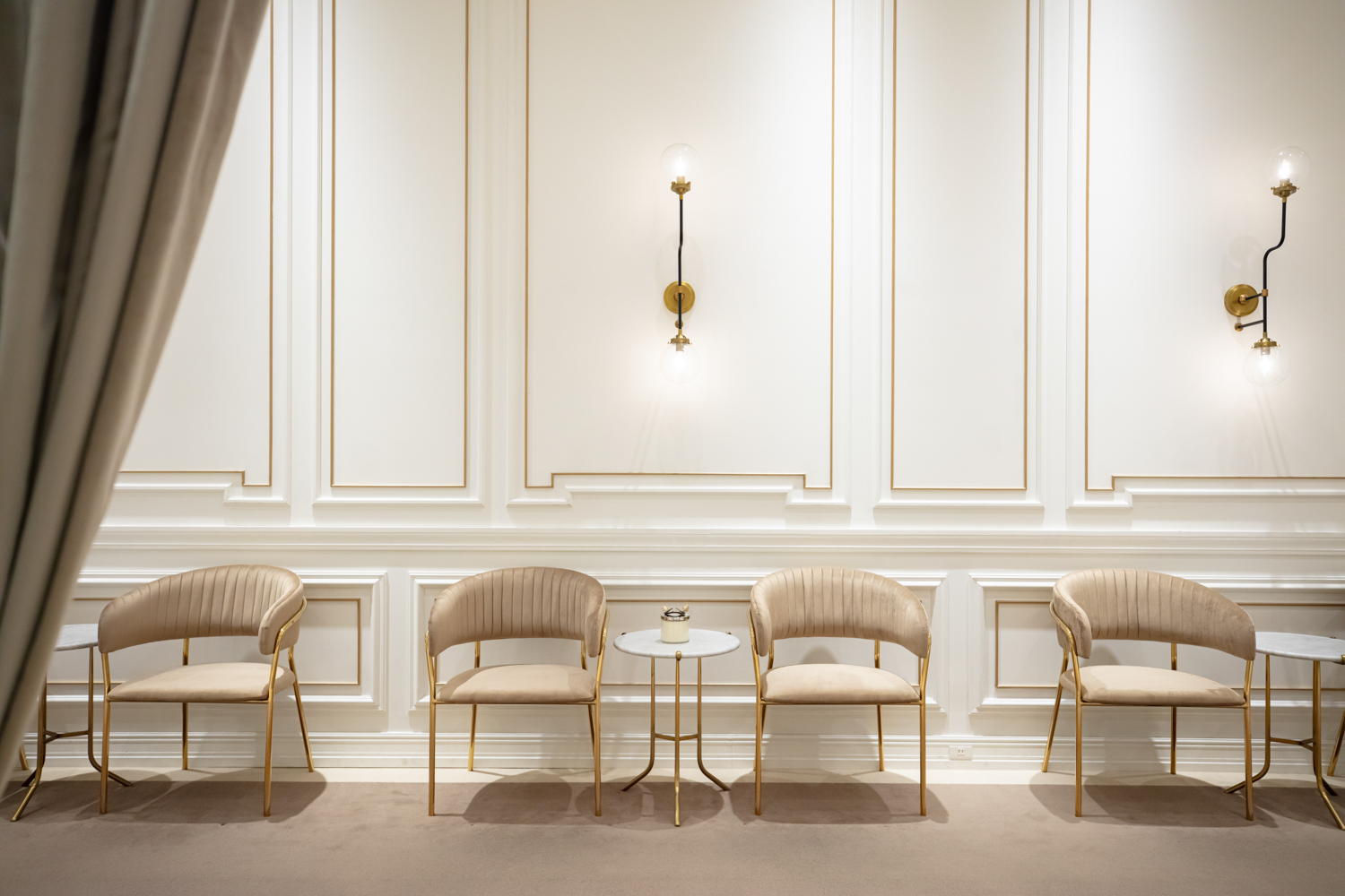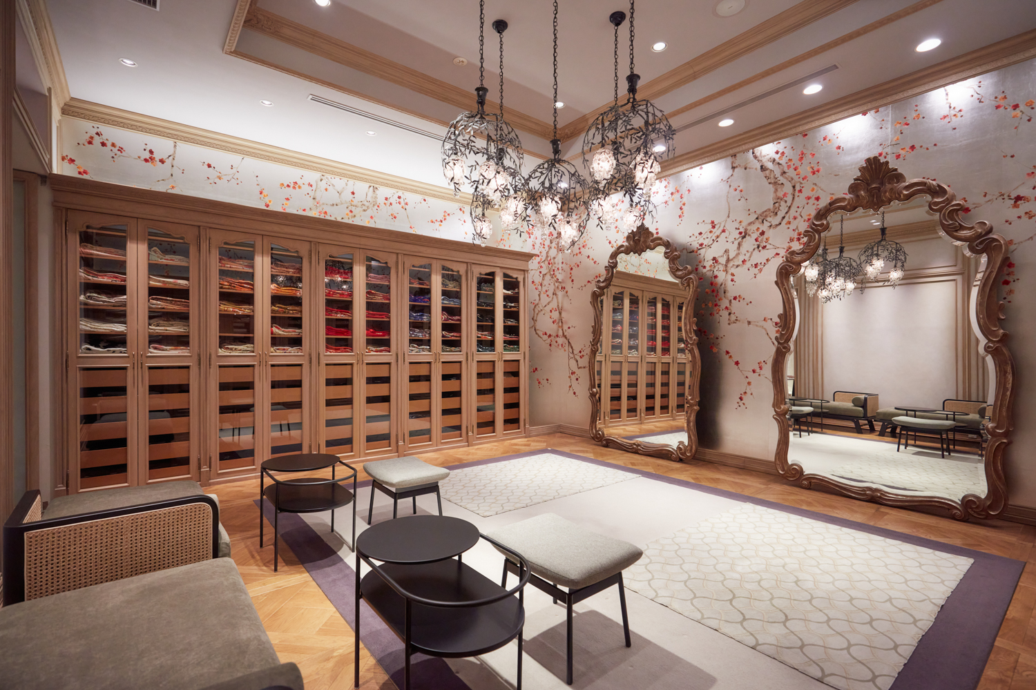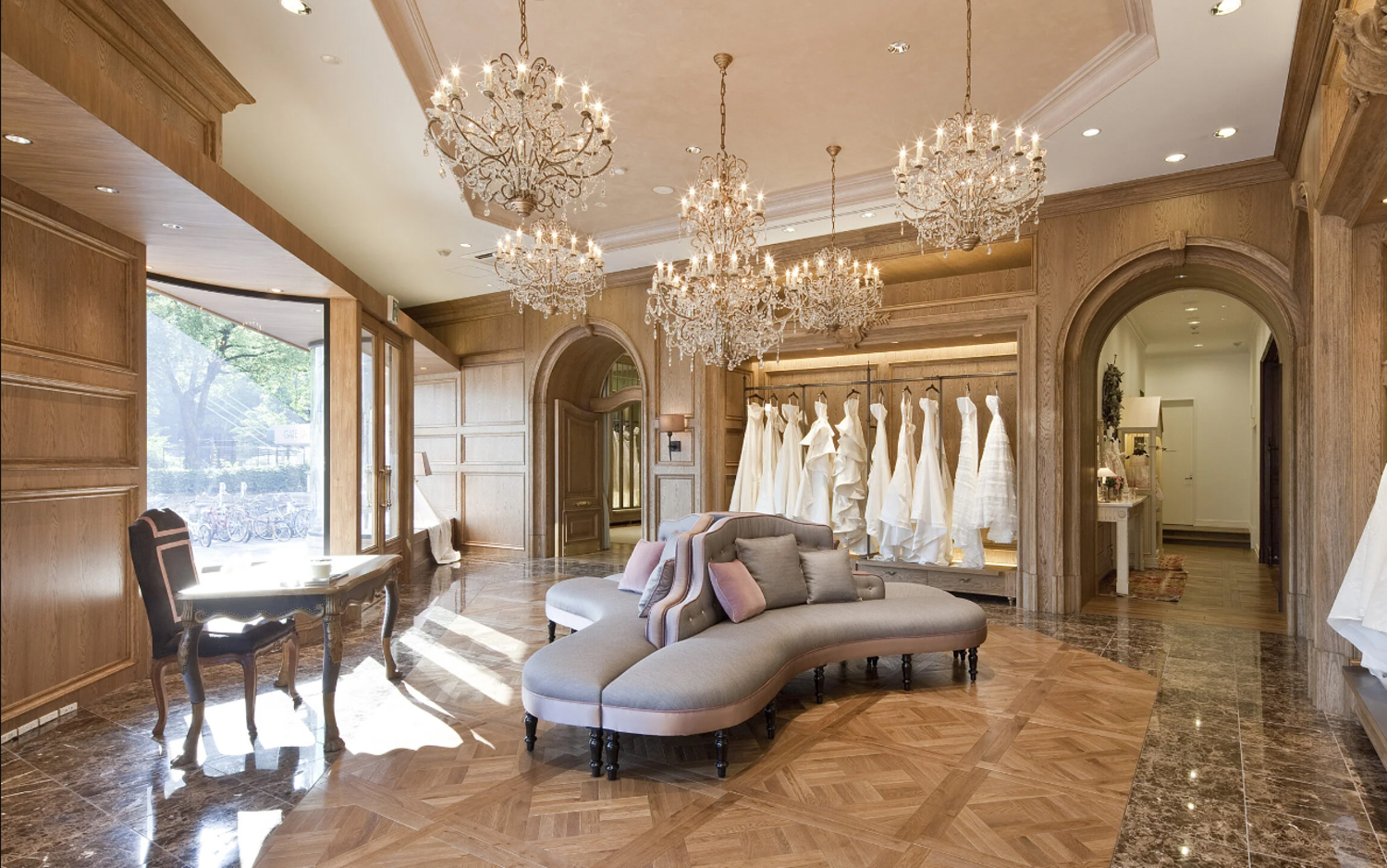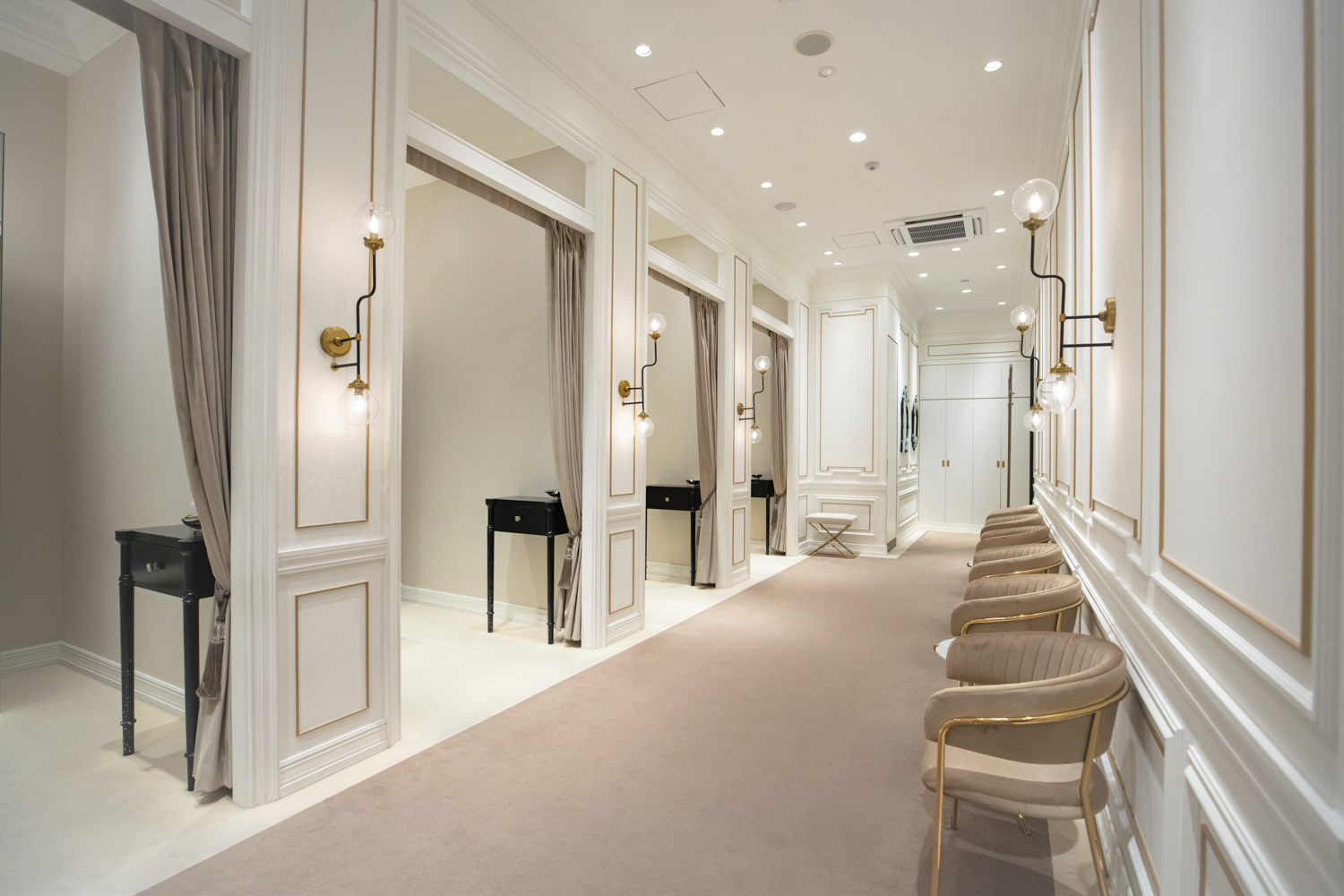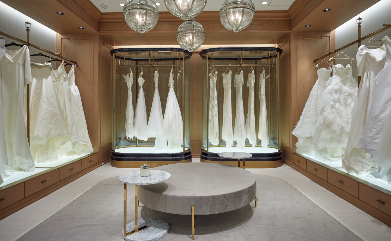 レセプションは大きなディスプレイウィンドウからたっぷりの光が差し込み、高い天井に煌びやかなシャンデリアが飾られた非日常感を感じていただける特別な空間です。どこか趣のあるクラシカルな雰囲気の中に、大理石のテーブルやモダンなデザインのソファー、NYから買い付けをしたこだわりのインテリアが並んだ店内。世界のトップブランドからまだ名の知れない新しいブランドまで、世界各国の旬なブランドから買い付けたウェディングドレスが揃い、女性ごころをくすぐる世界感が目の前に広がります。ドレスが並ぶお部屋ごとに壁紙の色味やインテリアが異なり、どんなテイストのウェディングドレスでも輝くような空間は、セレクトショップならではのこだわりです。