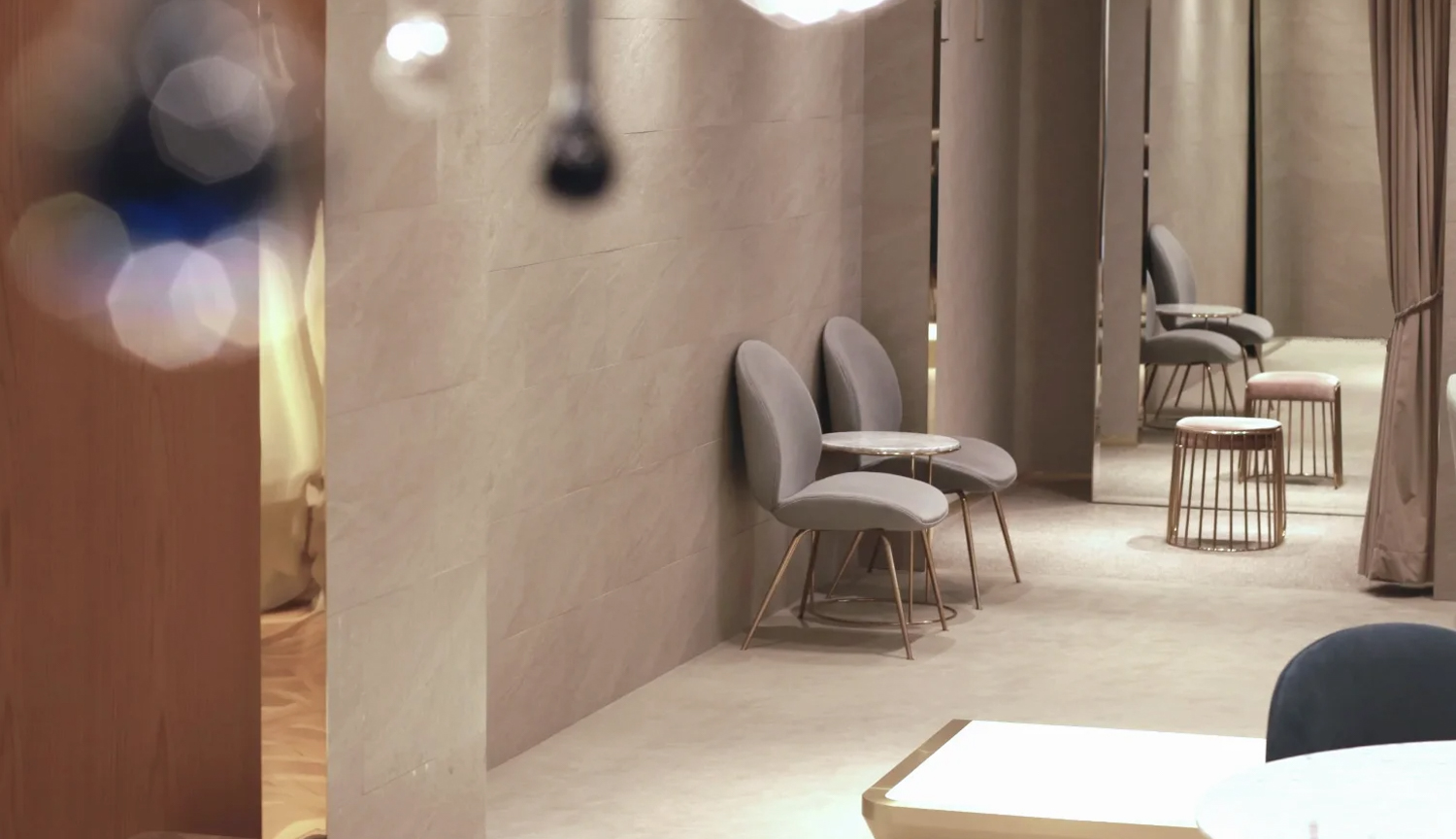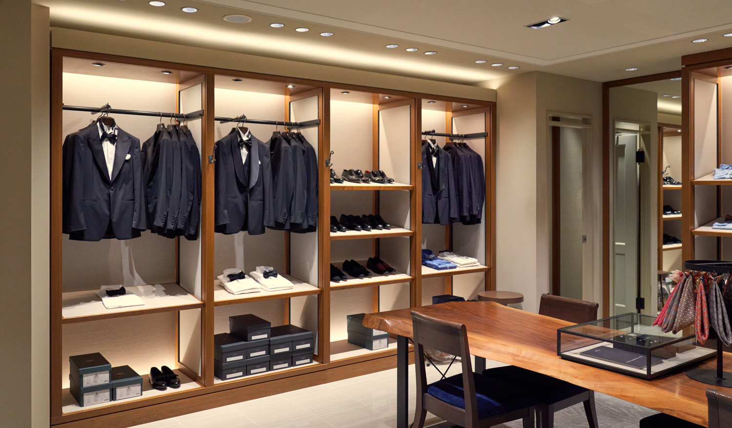 海外ブランドのショップが立ち並ぶ青山通りからほど近く落ち着いた大人の雰囲気が漂う骨董通りにアディション店が完成しました。これまでのTREATの集大成とも言えるショップはエリアごとに異なる表情を見せる新たなコンセプトショップです。エレベーターを降りてすぐ広がるアプローチは美術館のようなギャラリースペースに。ブラックの家具や什器を用い、ハイクラスなフレンチテイストを表現したレセプション。モノクロのタイルやマスタードカラーのカーテンをポイントにした艶やかなモード感を取り込んだドレスエリア。アンティークウッドを多用し、ナチュラルテイストのリラックス感溢れるフィッティングエリア。セレクトショップを思わせる無垢の一枚板の大きなテーブルがメンズライクなメンズコーナーなど、スタイリッシュでアーバンな雰囲気に程よくヴィンテージ感がミックスされた空間です。